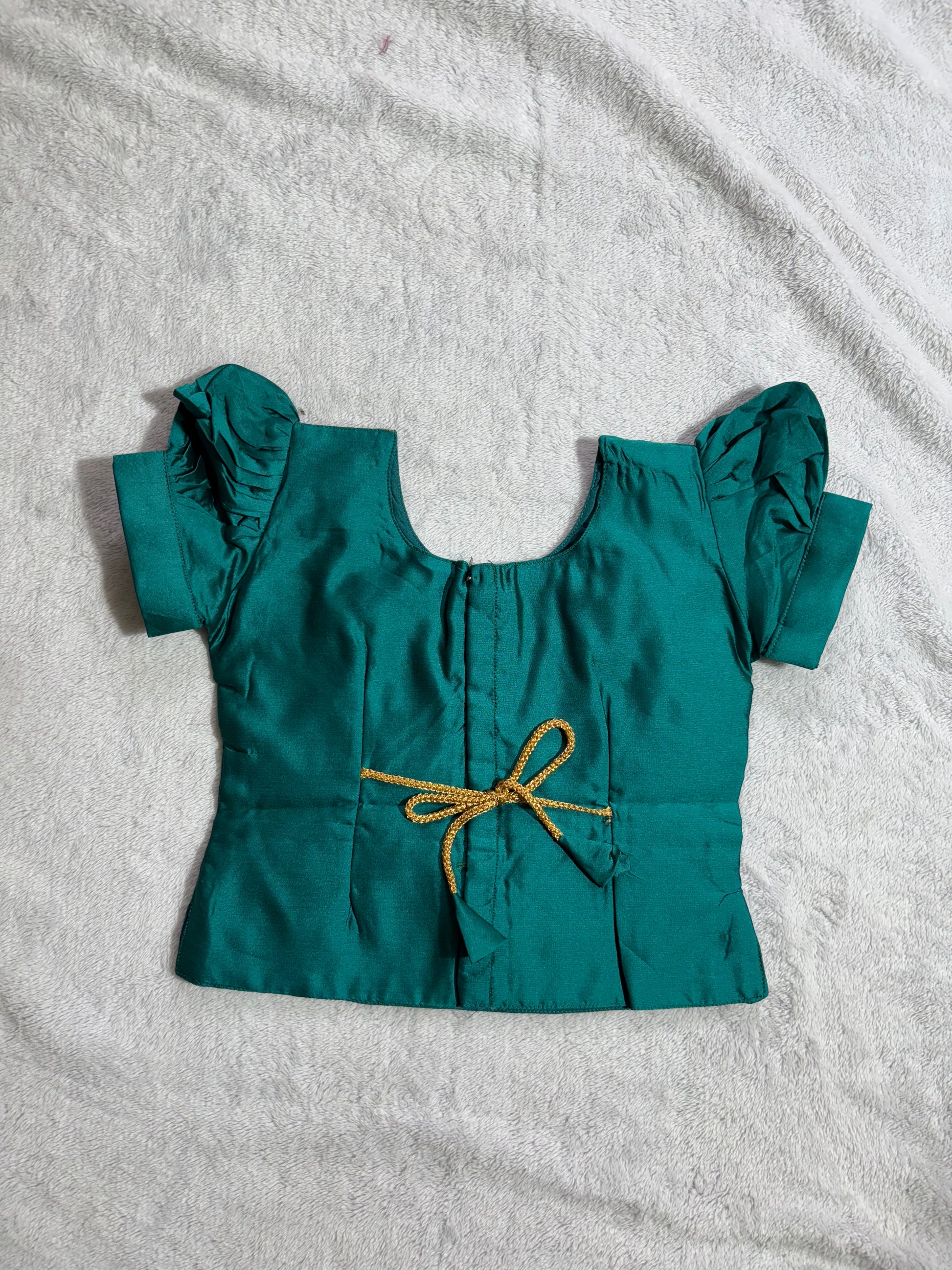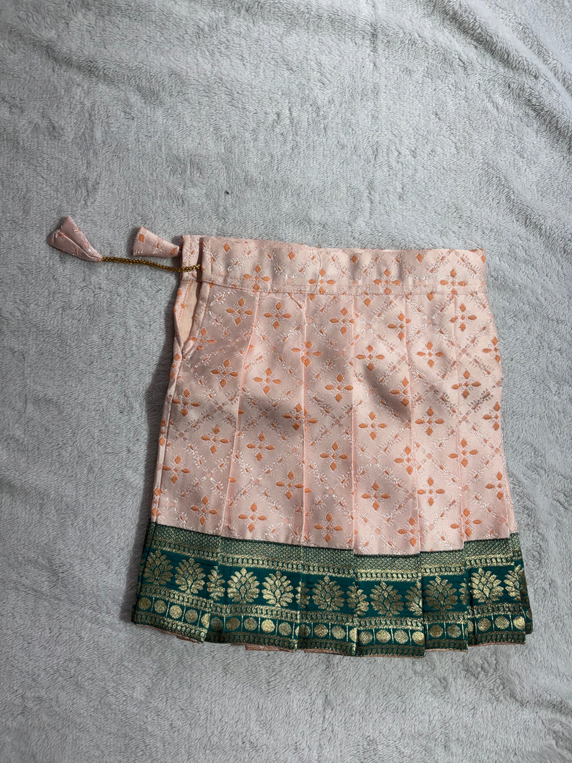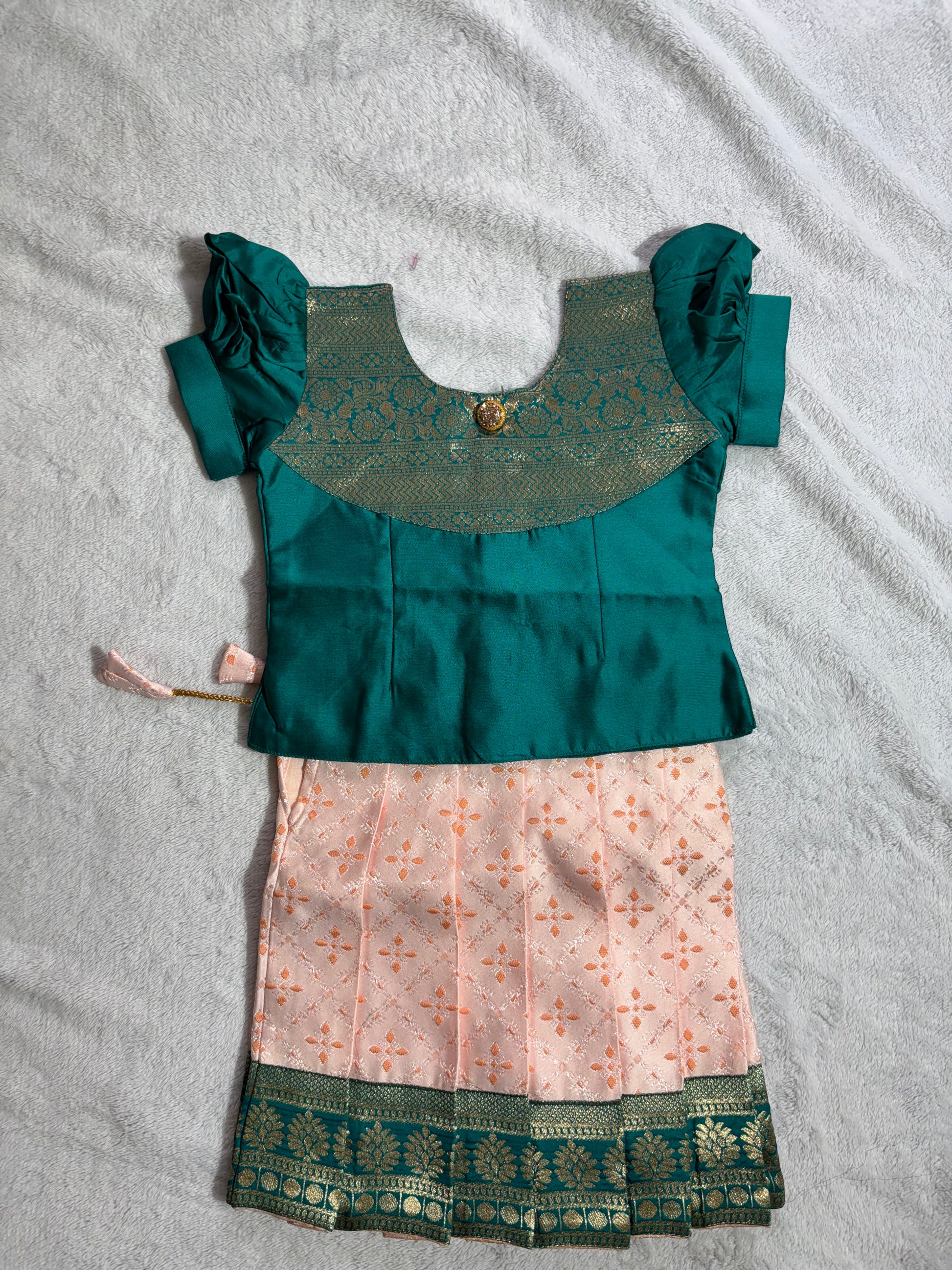 "Experience the elegance of our dark green blouse paired with a light peach lehenga pattu pavadai. Made with quality fabric, this outfit showcases a beautiful contrast of colors. Perfect for any occasion, it offers a stylish and sophisticated look. Stand out with this unique and stunning ensemble."