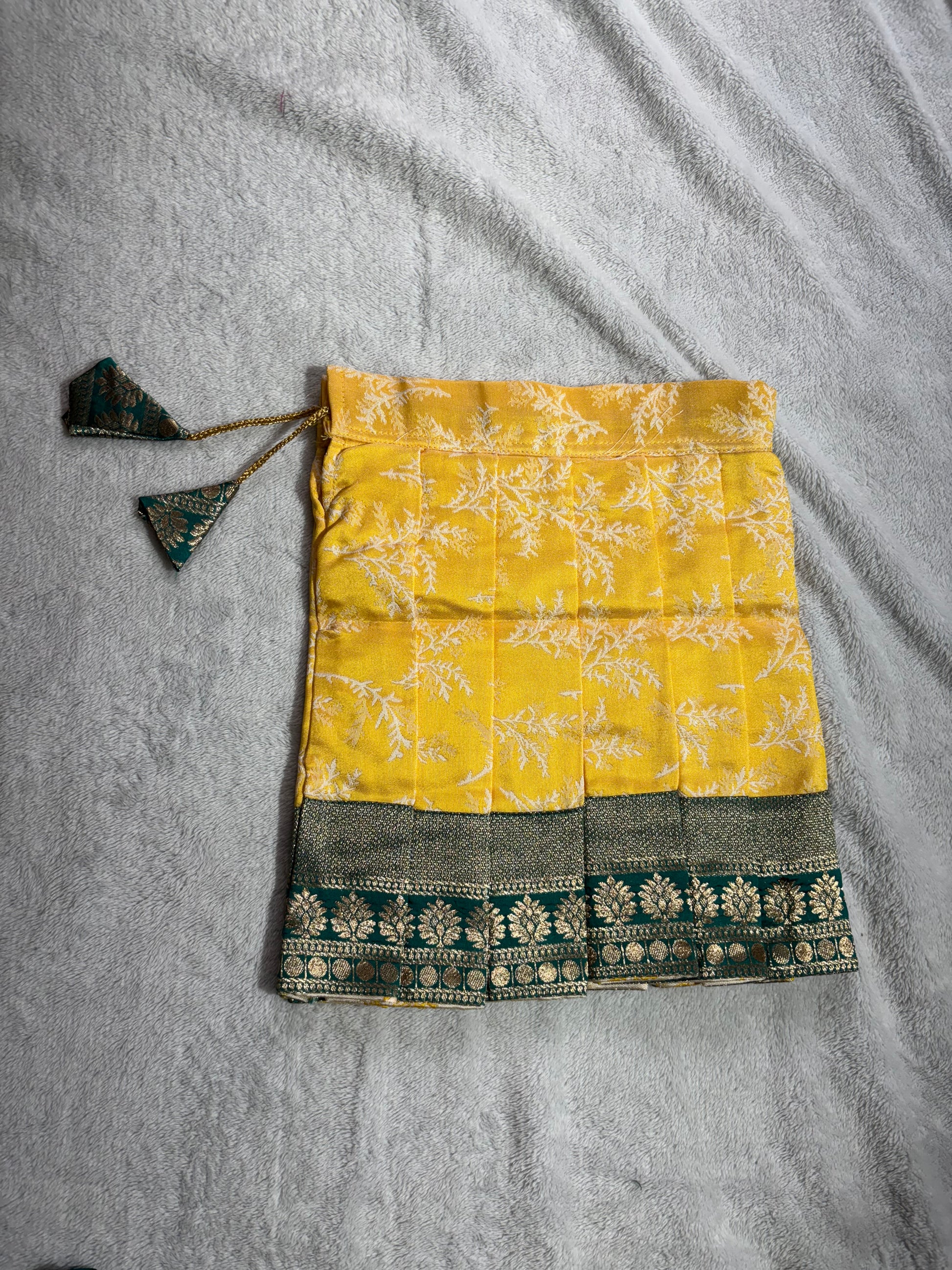 This elegant ensemble features a dark green blouse paired with a mustard yellow lehenga pattu pavadai, blending rich traditional craftsmanship with vibrant colors. The blouse’s deep green hue complements the bright mustard yellow skirt, creating a striking contrast ideal for festive occasions. Crafted from premium pattu fabric, this set offers both durability and a luxurious sheen, ensuring you stand out with timeless grace and comfort. Perfect for cultural celebrations, this combination highlights expert tailoring and classic South Indian style.