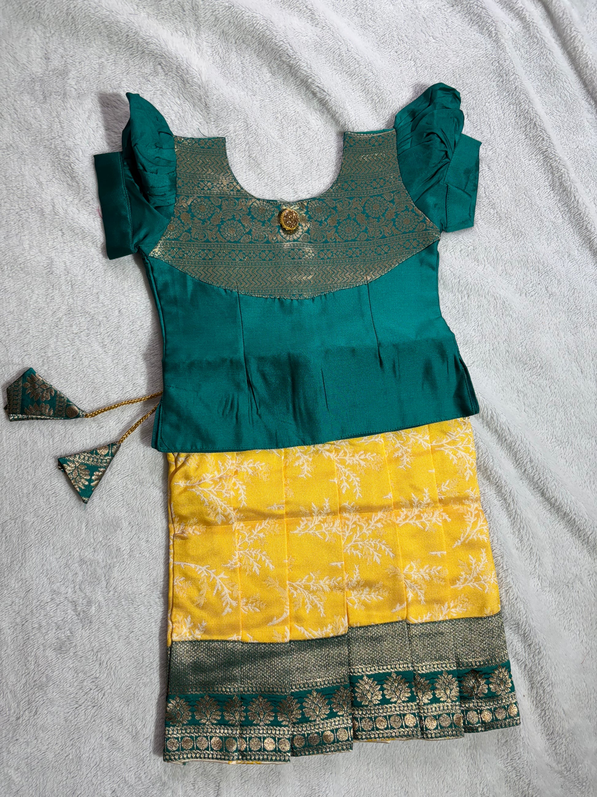 Dark green blouse with mustard yellow lehenga pattu pavadai