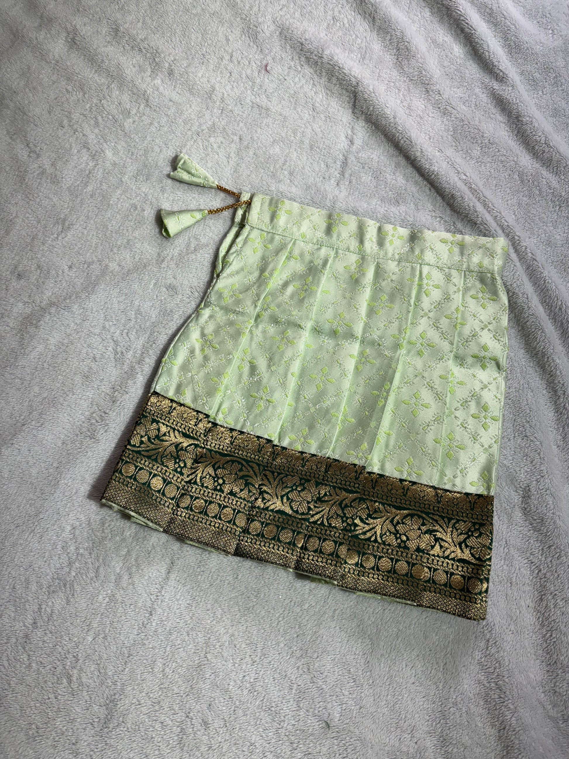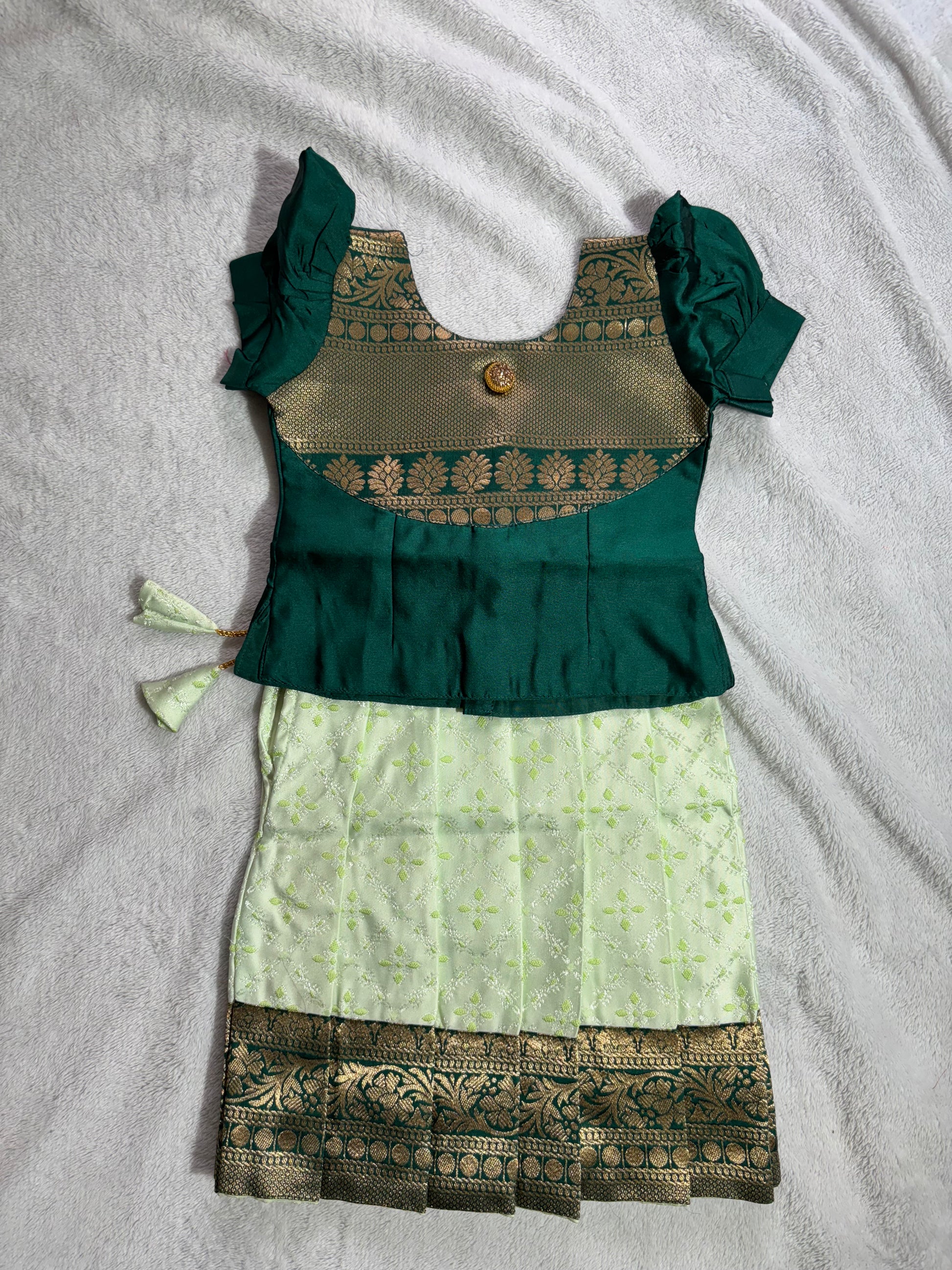 Dark green blouse with pista green lehenga pattu pavadai blouse with