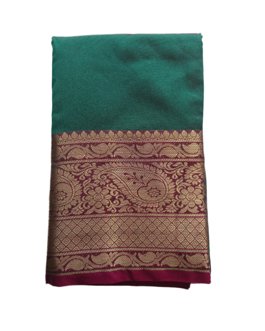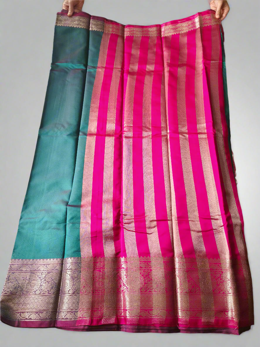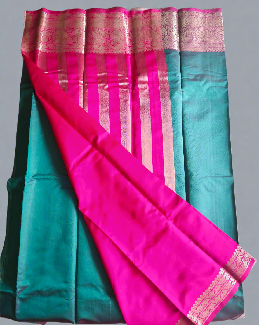 This exquisite Semi silk saree features a dual shade vibrant teal green body contrasted beautifully with a bright pink pallu and pleats, making it a perfect choice for weddings, festive occasions, and celebrations. The saree is adorned with intricate zari weaving in gold, showcasing traditional floral and paisley motifs along the borders and pallu.