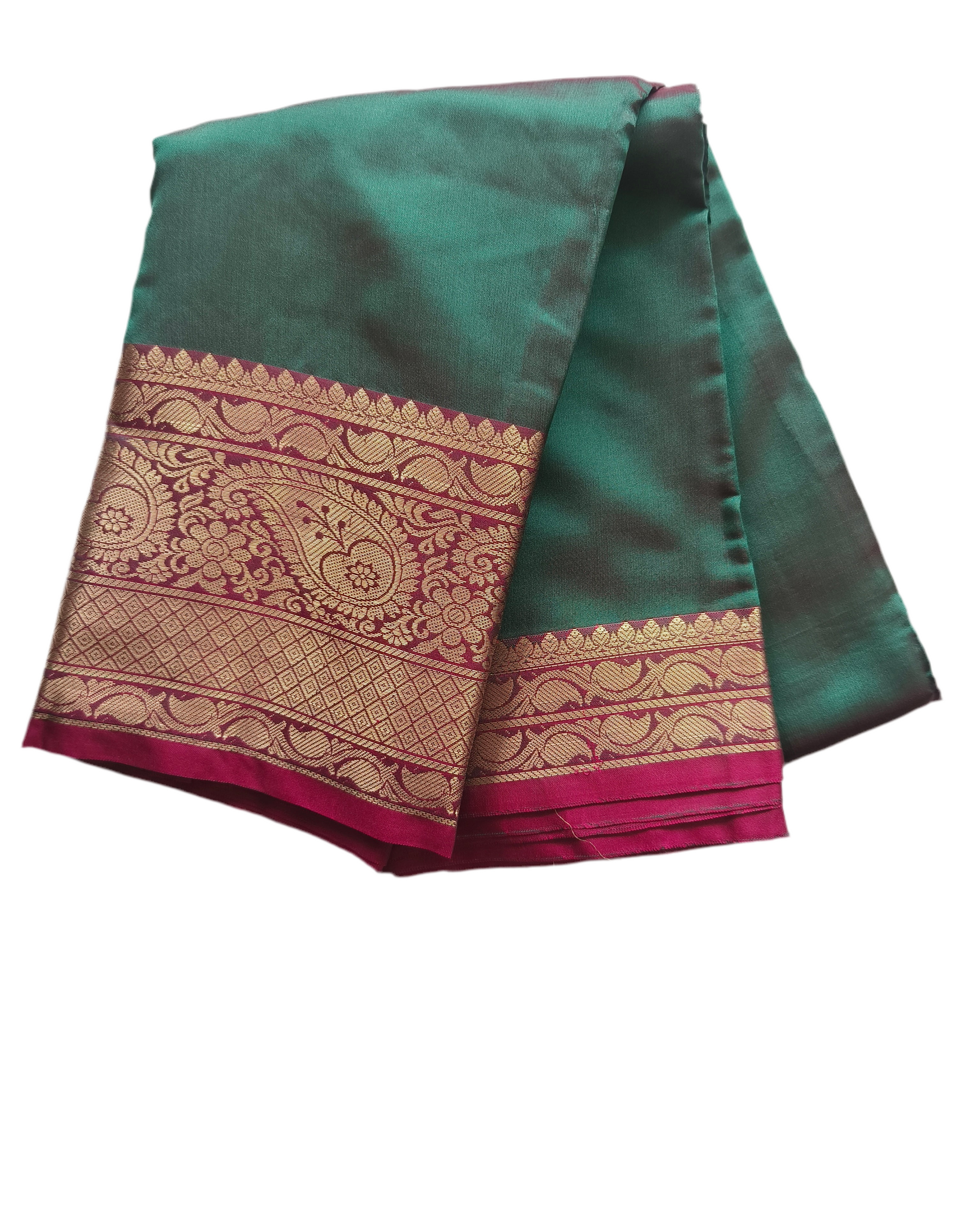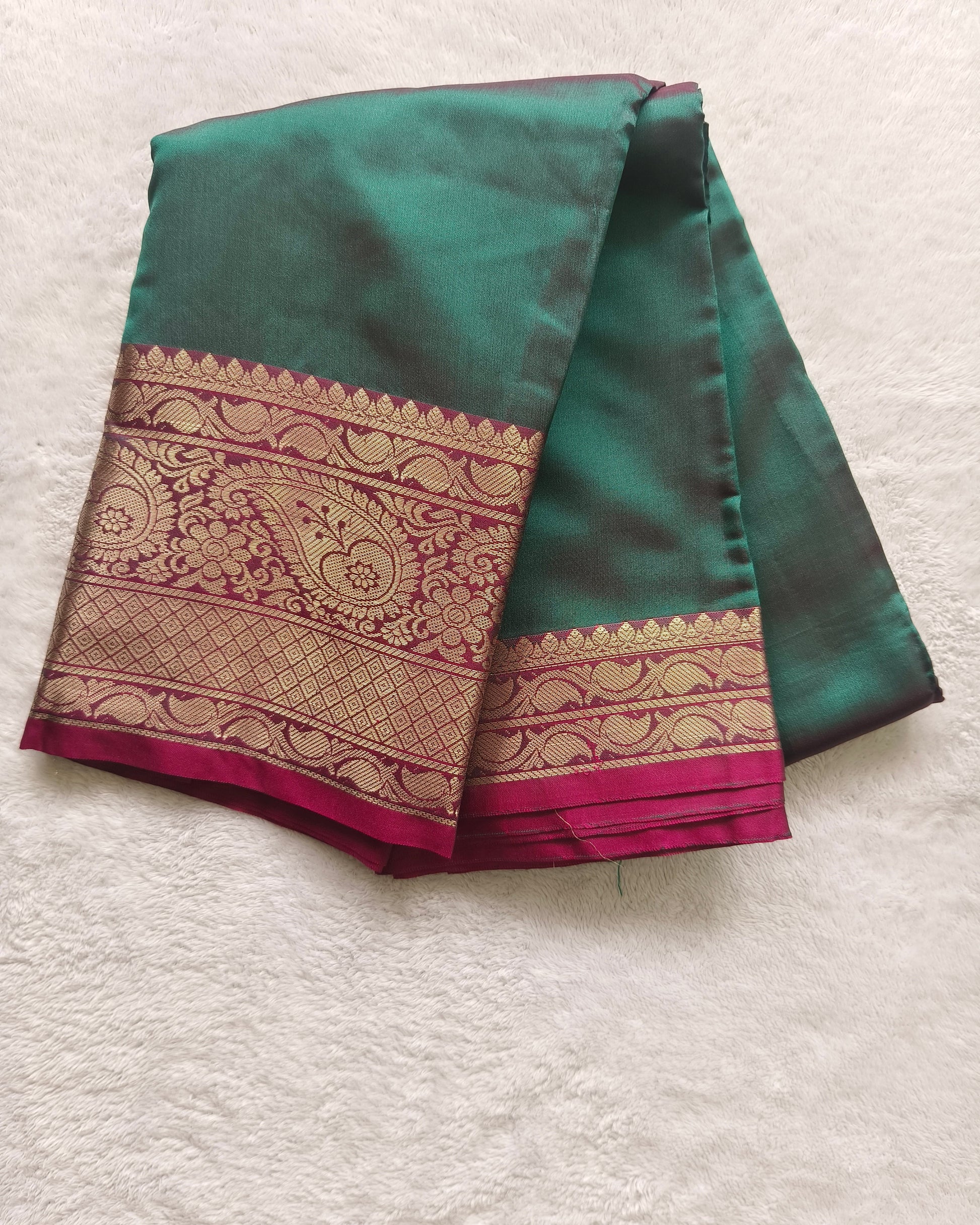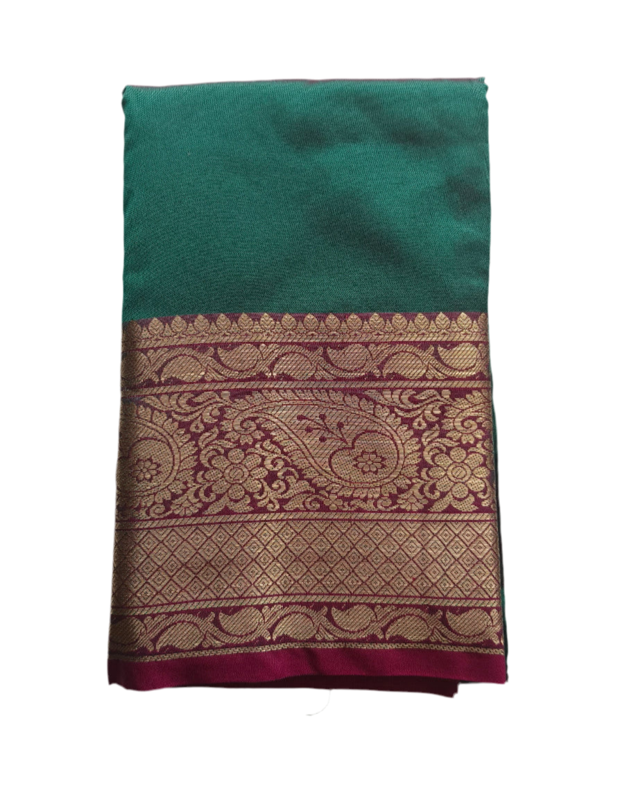 This exquisite Semi silk saree features a dual shade vibrant teal green body contrasted beautifully with a bright pink pallu and pleats, making it a perfect choice for weddings, festive occasions, and celebrations. The saree is adorned with intricate zari weaving in gold, showcasing traditional floral and paisley motifs along the borders and pallu.