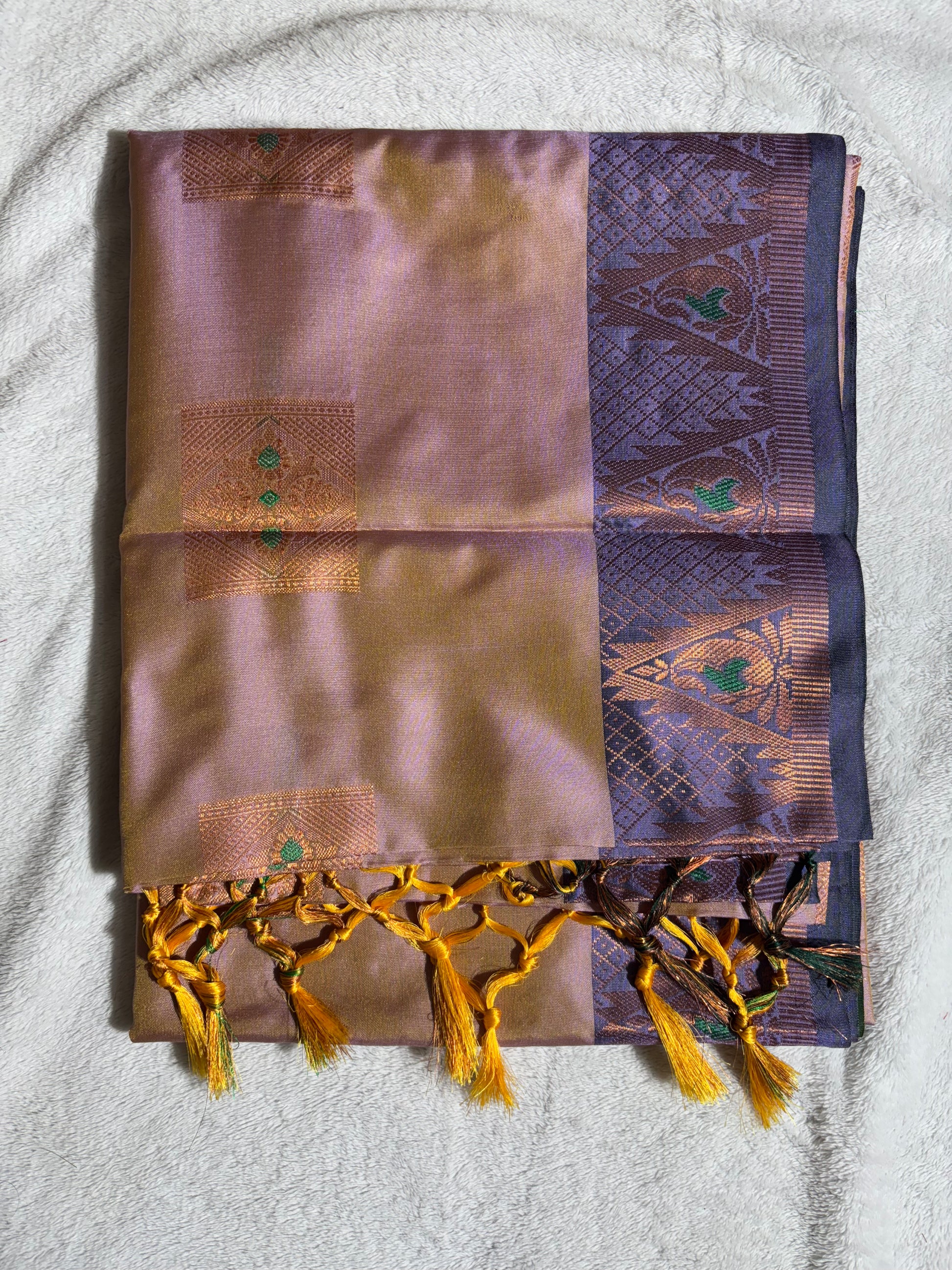 Lavender with purple soft silk saree wth temple border and tassels