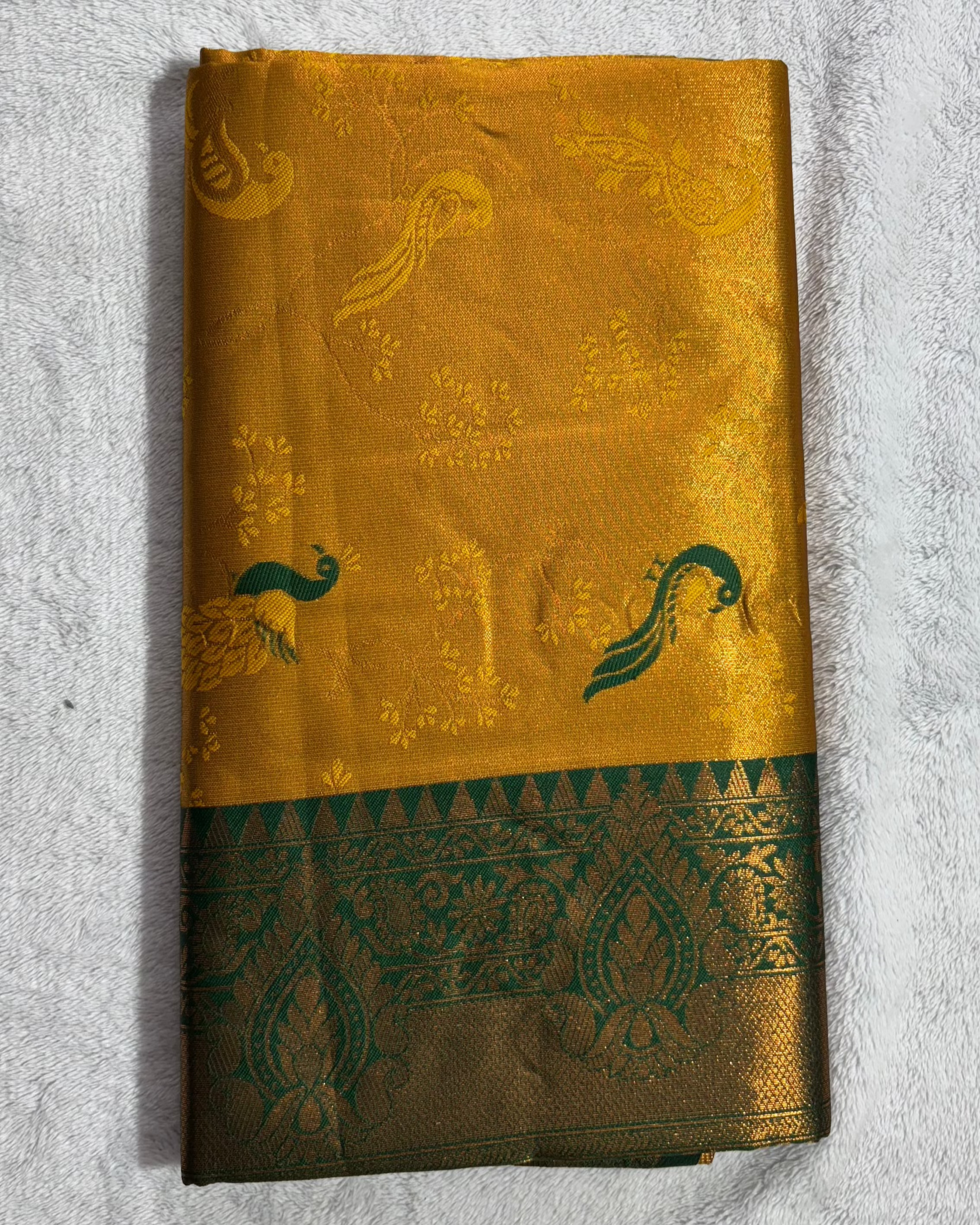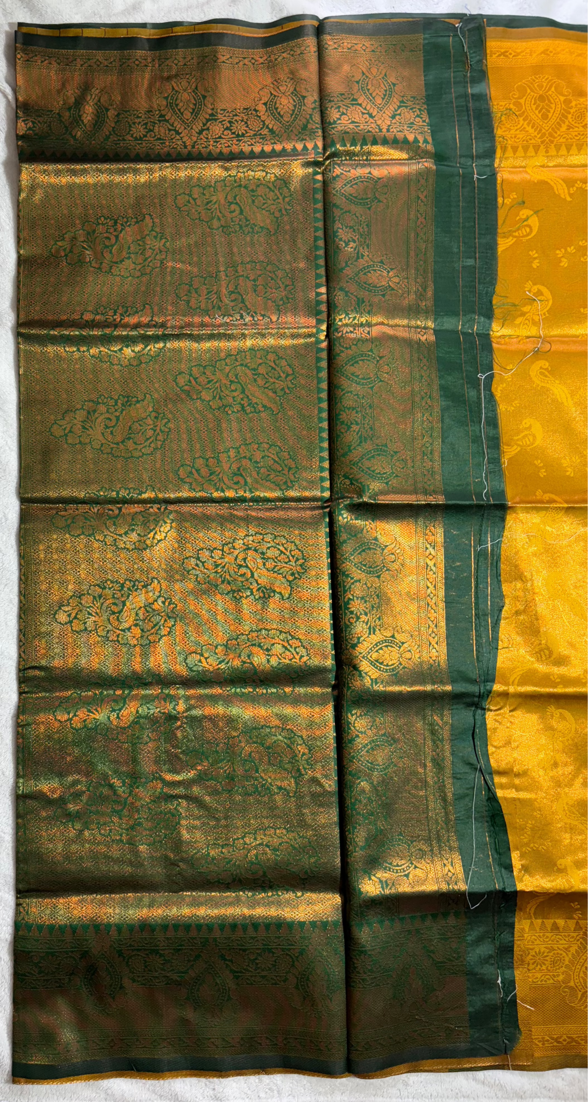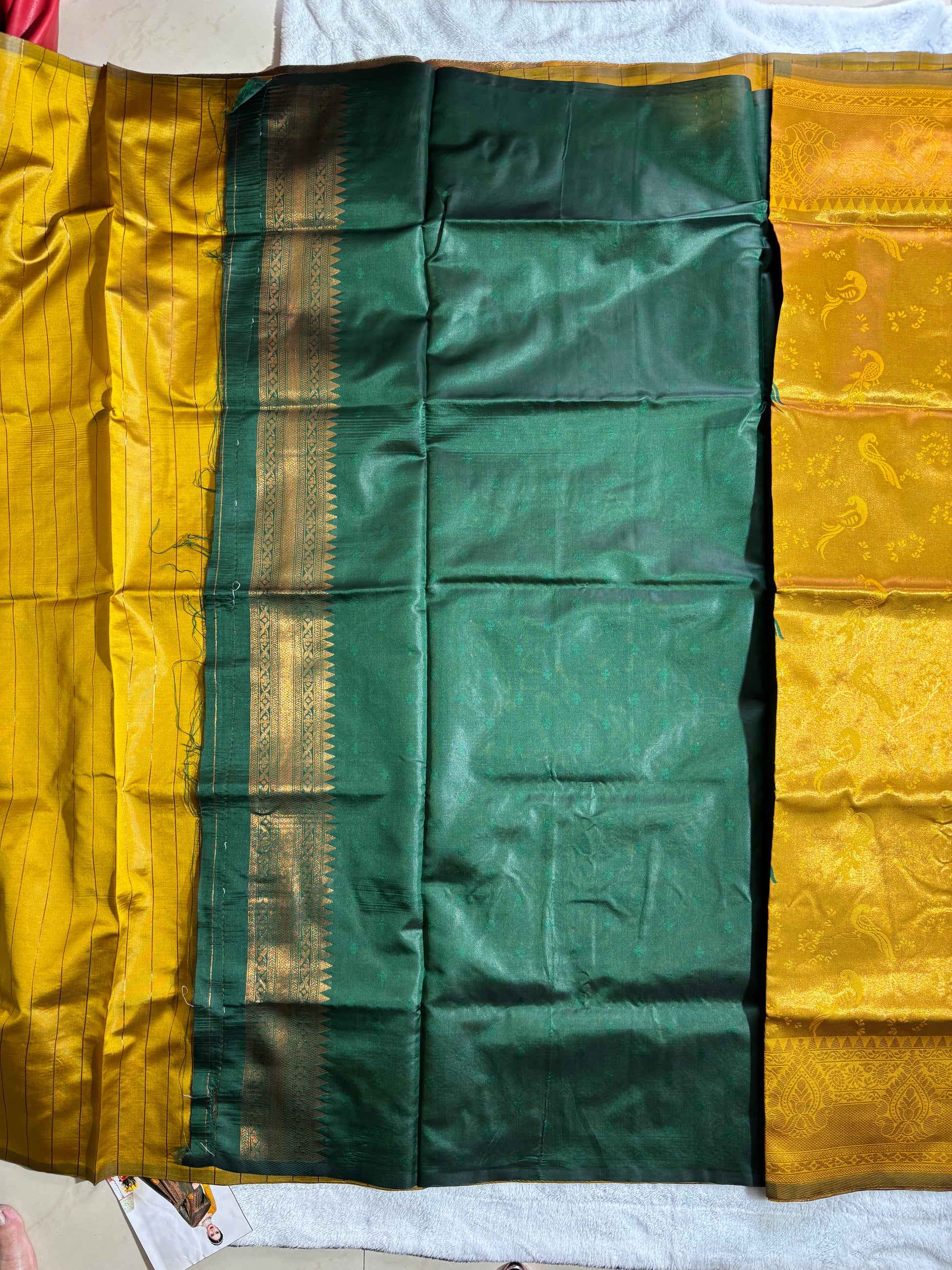 Beautiful mustard yellow with contrast dark green semi silk sarees in budget friendly segment