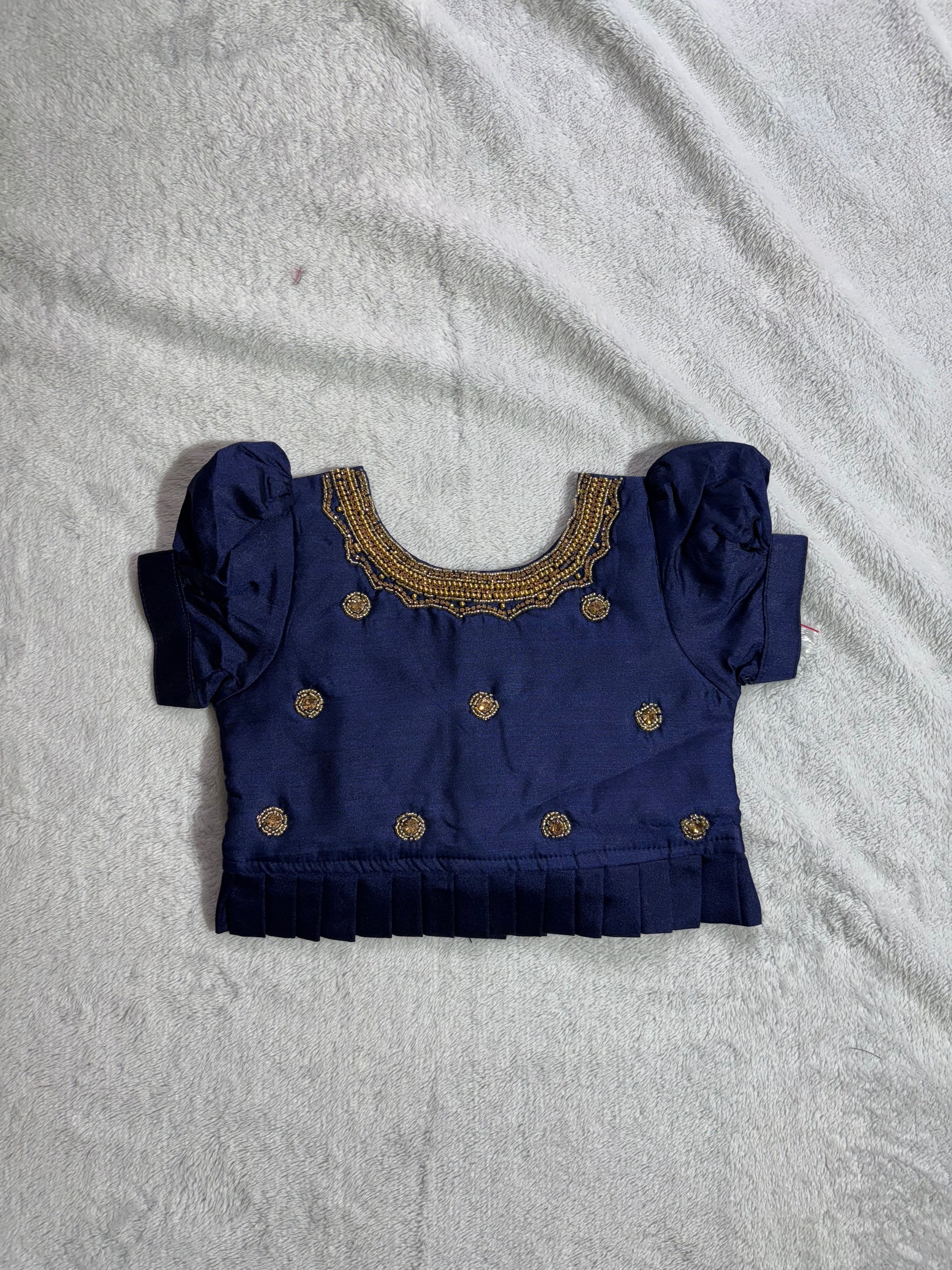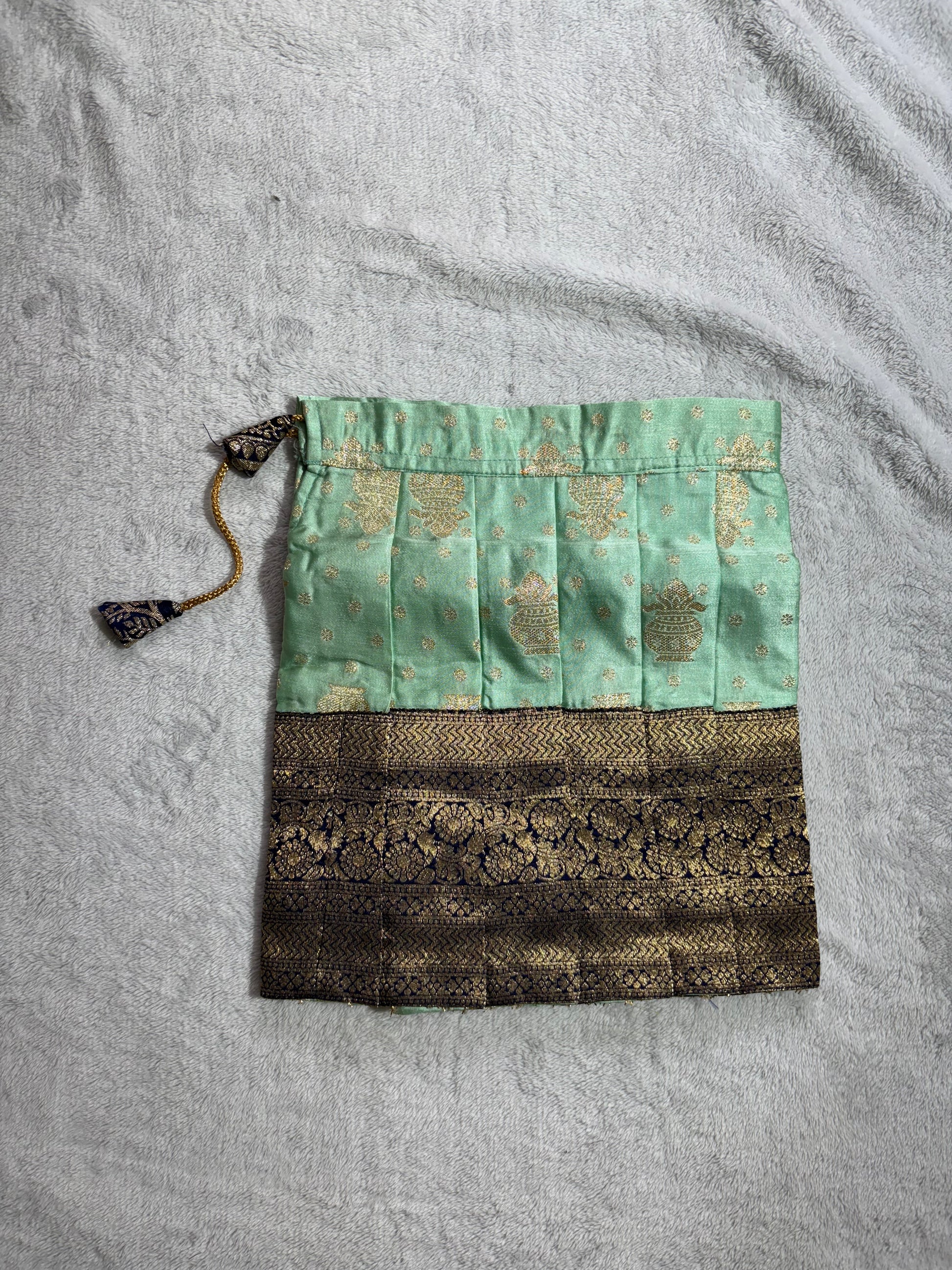 Experience timeless elegance with our Navy Blue Blouse and Pista Green Lehenga Pattu Pavadai. The intricate handmade aari work adds a touch of sophistication to the rich navy blue fabric. The contrasting pista green lehenga adds a pop of color, making this ensemble perfect for any special occasion.