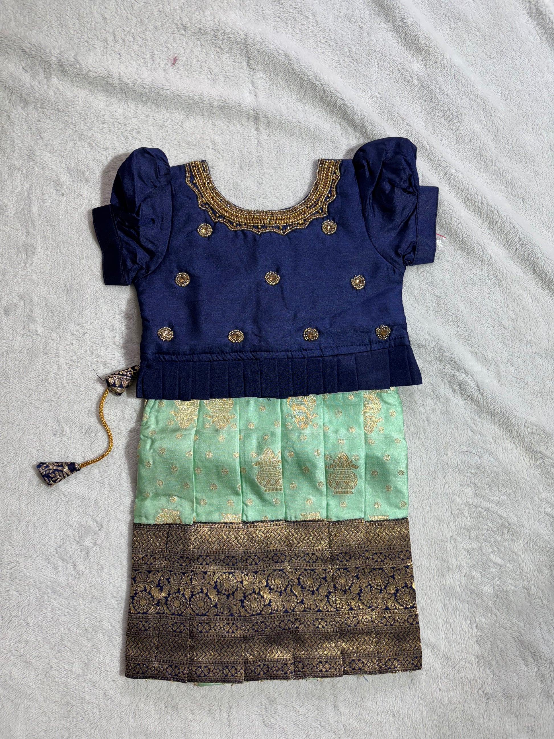 Navy blue blouse with handmade are work all over and pista green lehenga pattu pavadai