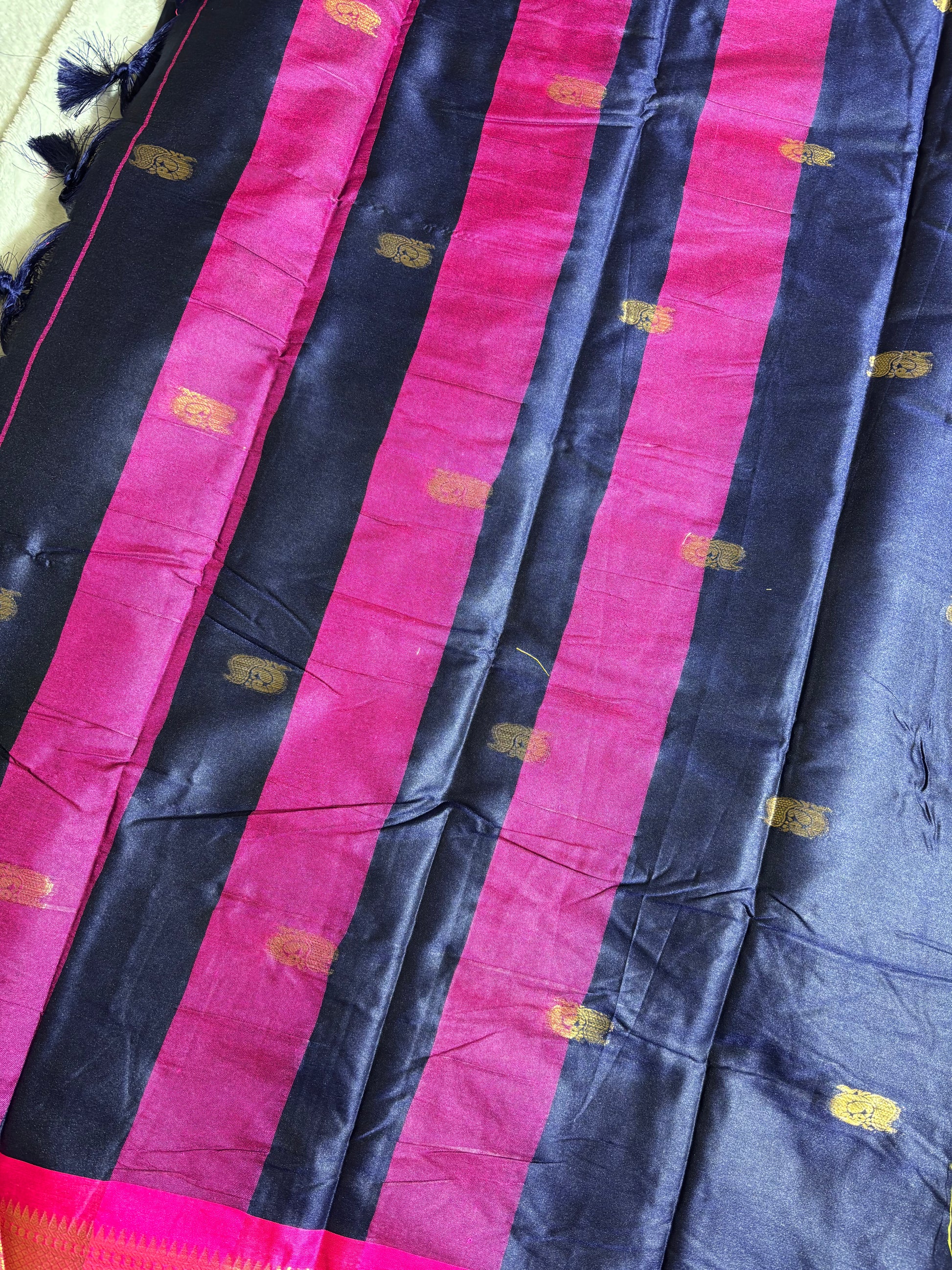 Expertly crafted, this silk cotton saree features a stunning navy blue and pink color combination. With an intricate peacock buttes pattern all over, this saree exudes elegance and sophistication. Perfect for any occasion, this saree will make you stand out with its unique design and luxurious fabric.
