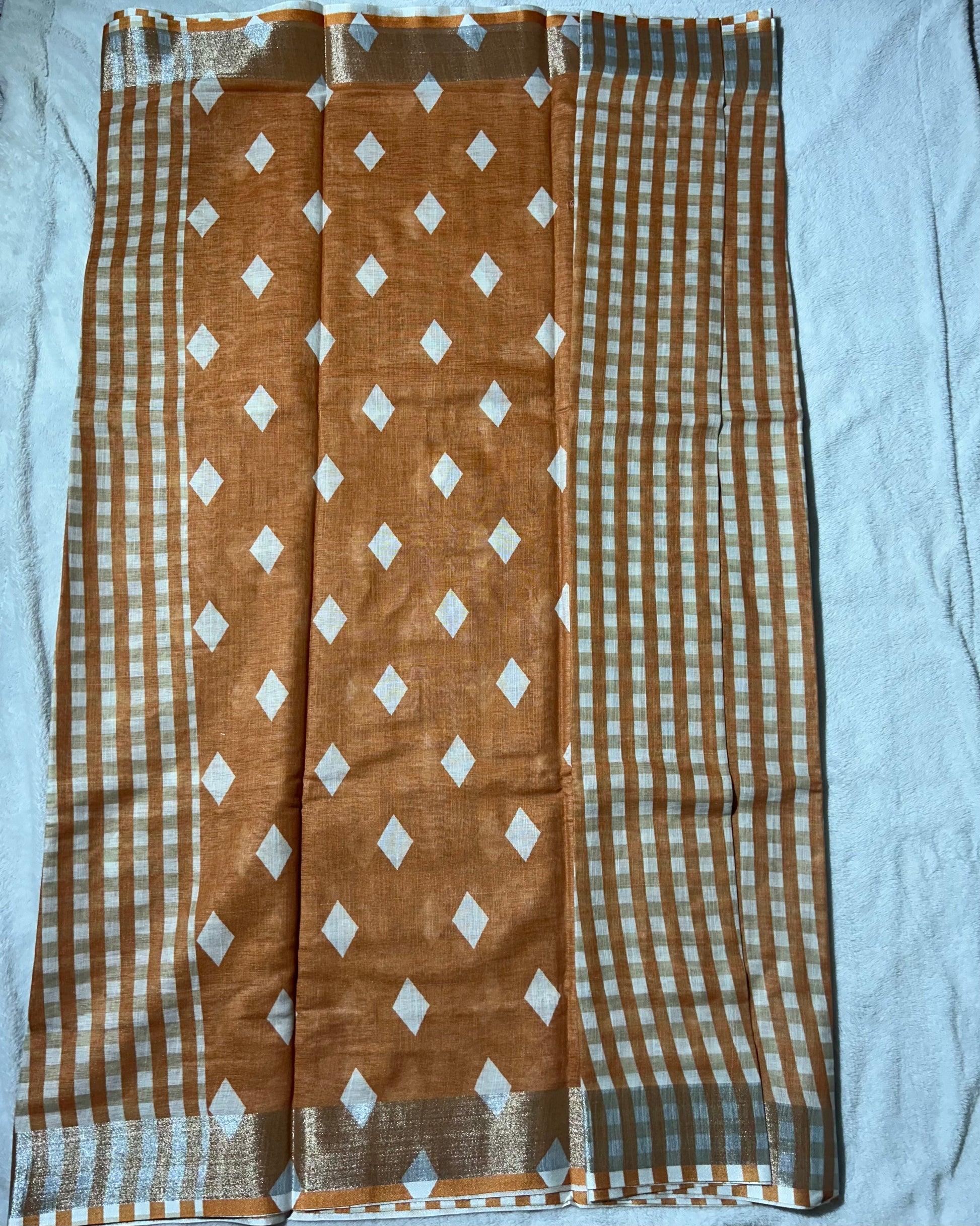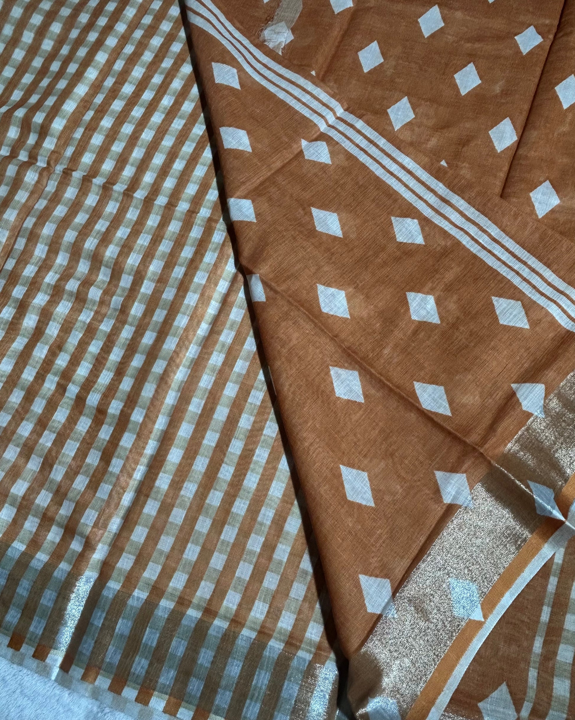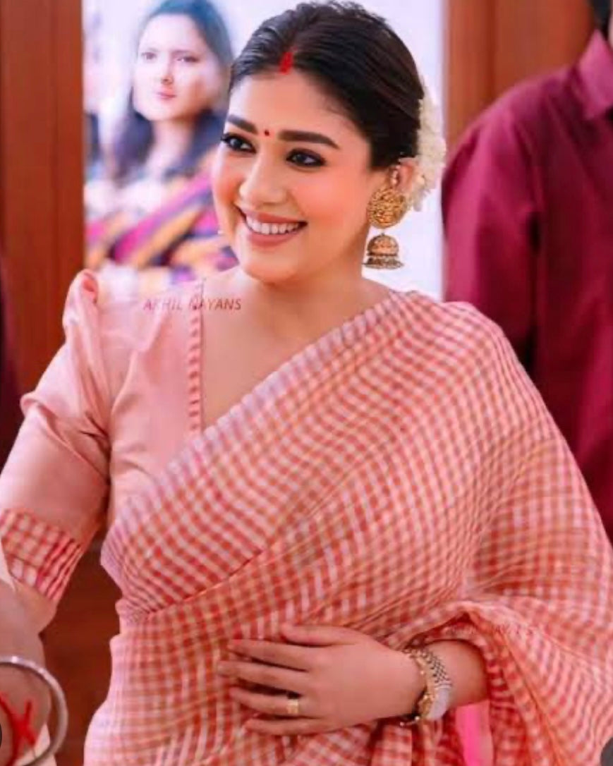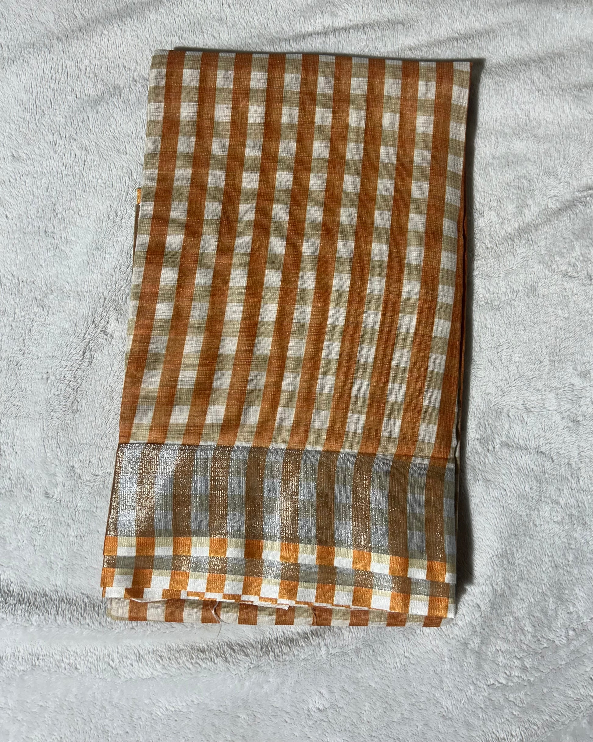 This Nayanathara inspired cotton silk checks saree in orange is a beautiful blend of traditional and contemporary design. Made with high-quality fabric, it offers comfort, style, and elegance. Perfect for any occasion, this saree is a must-have for any fashion-forward individual.