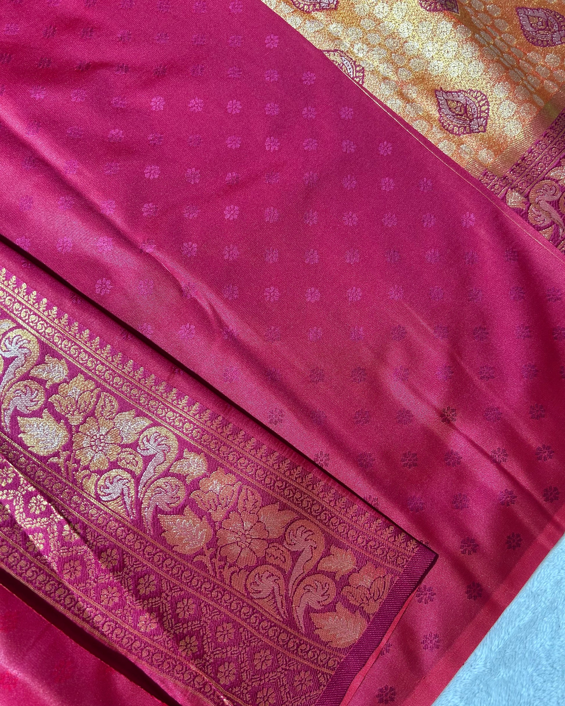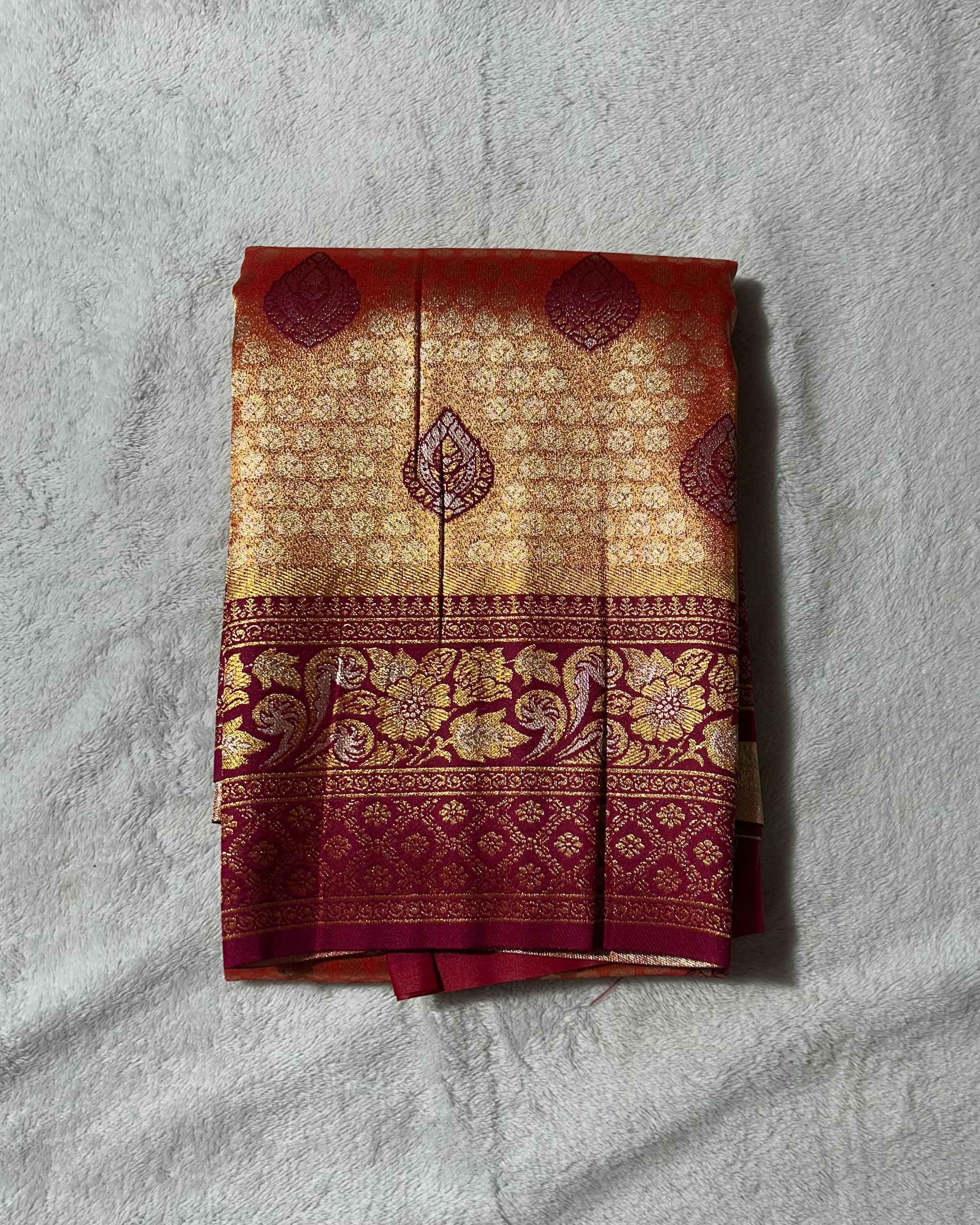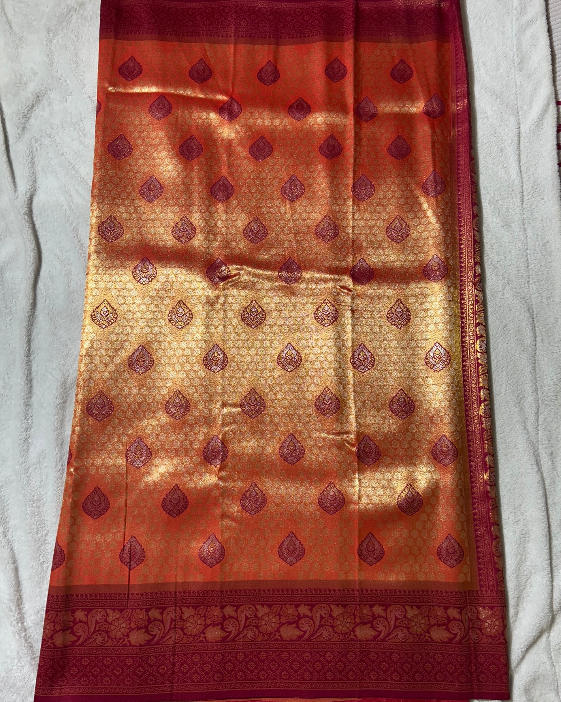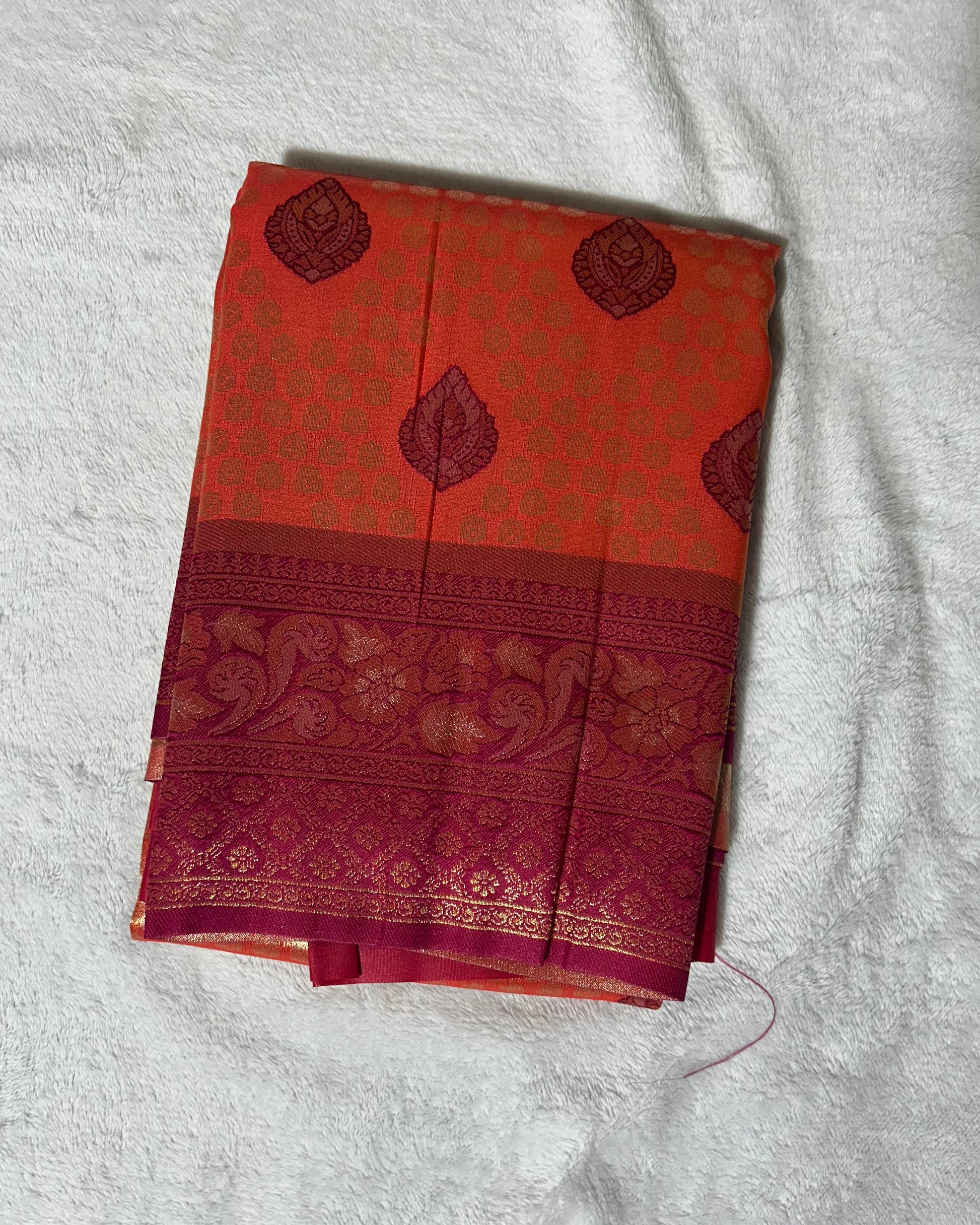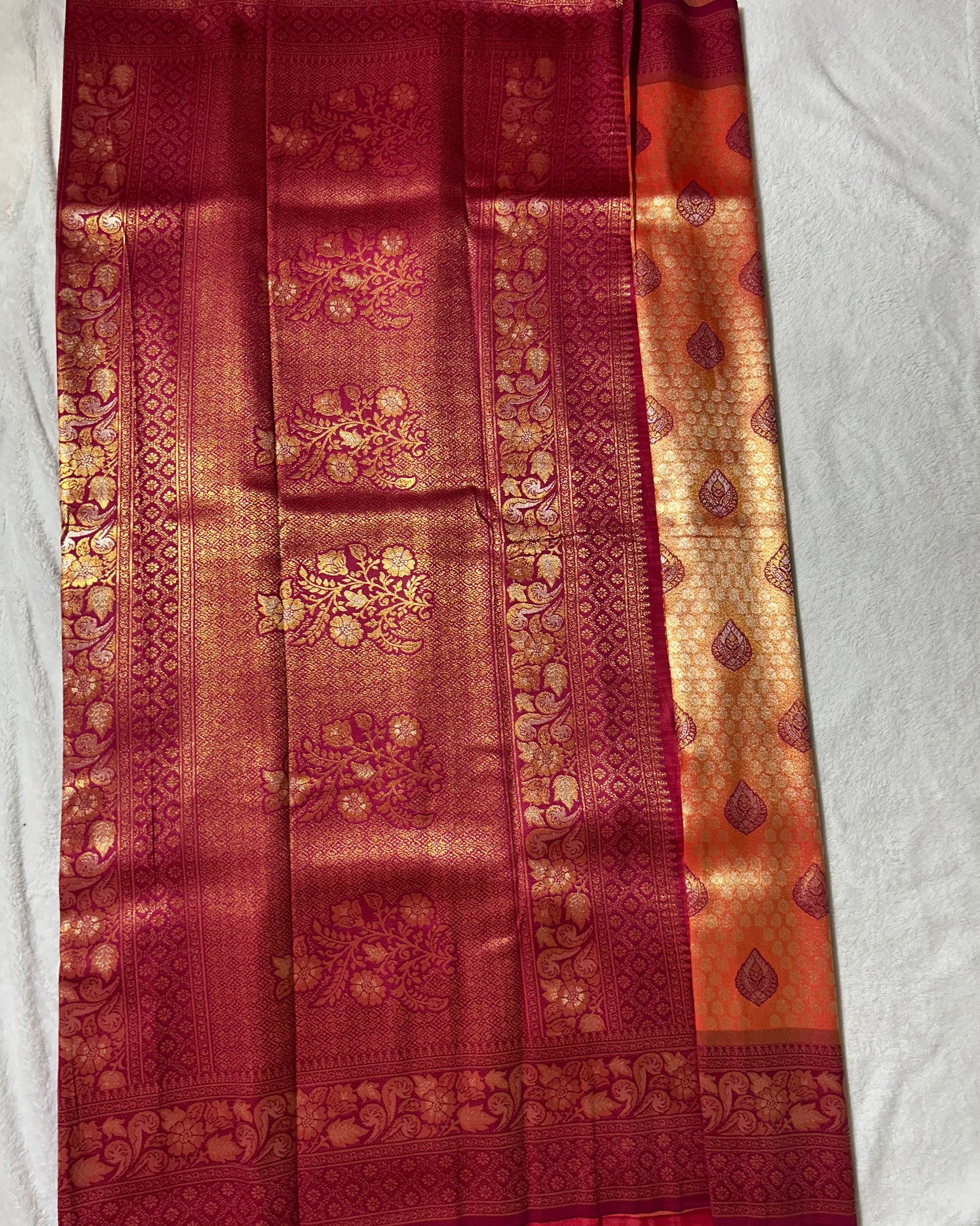 This exquisite saree features a stunning orange and pink color combination, crafted with Banaras Kanchipuram silk. Perfect for bridal occasions, this saree exudes elegance and sophistication. A must-have for any special event, this saree is sure to make a statement with its rich colors and fine silk fabrication.