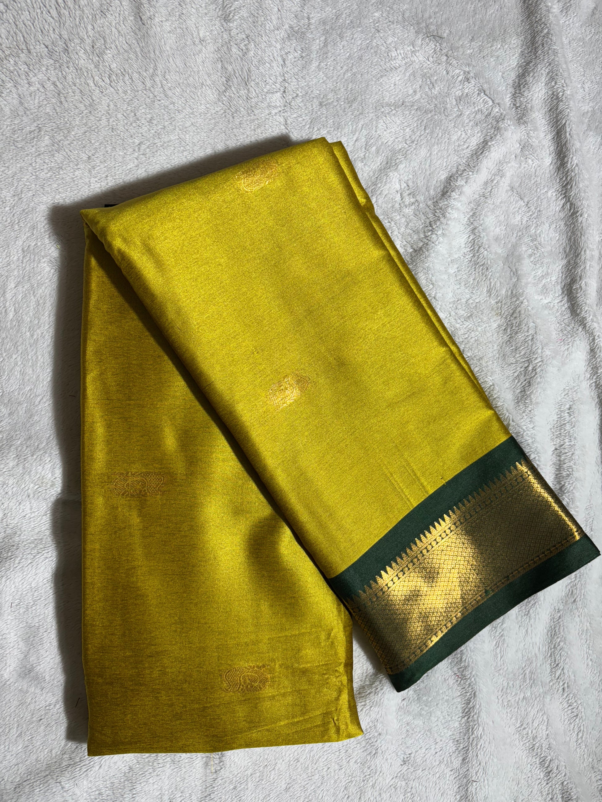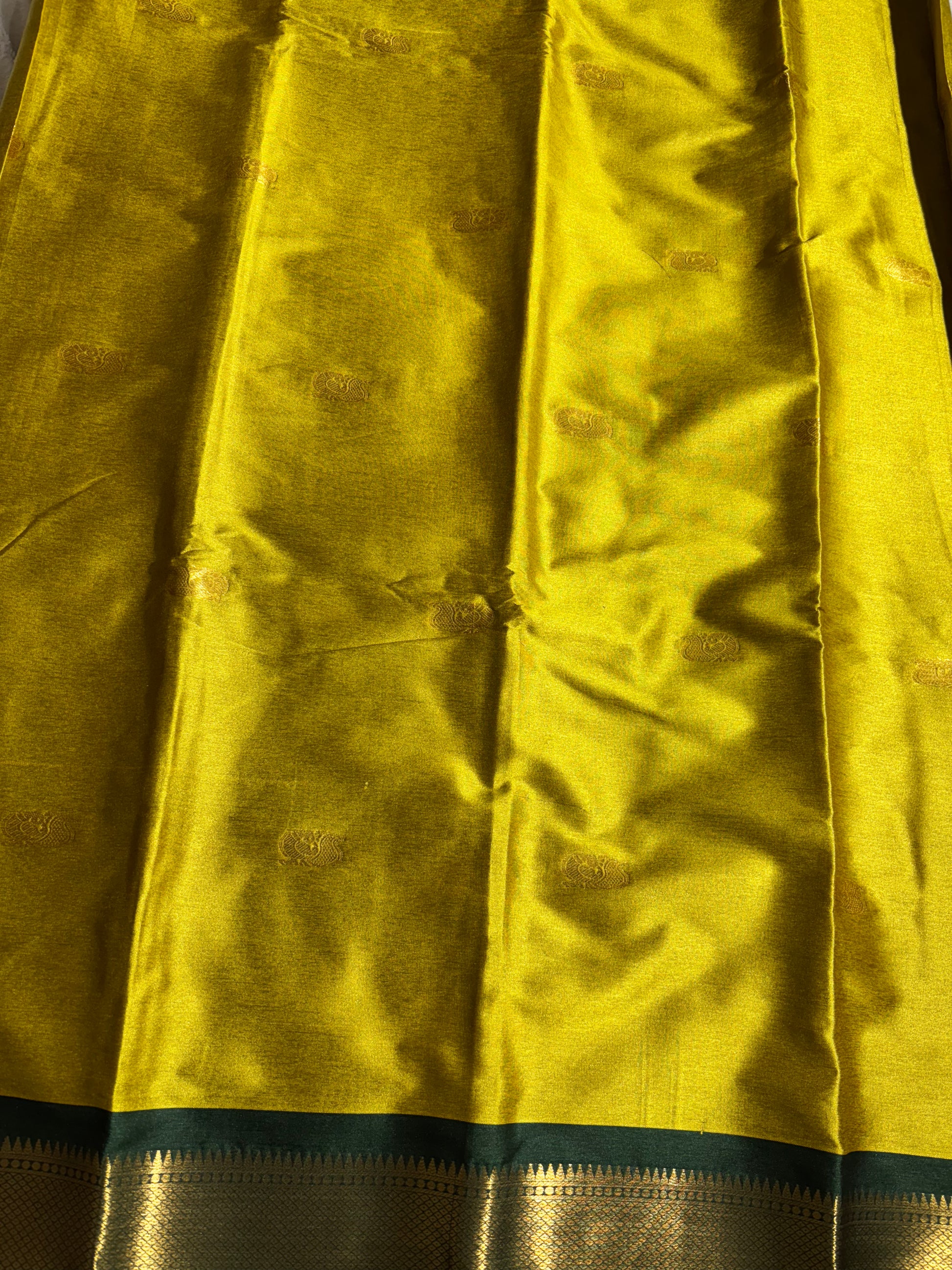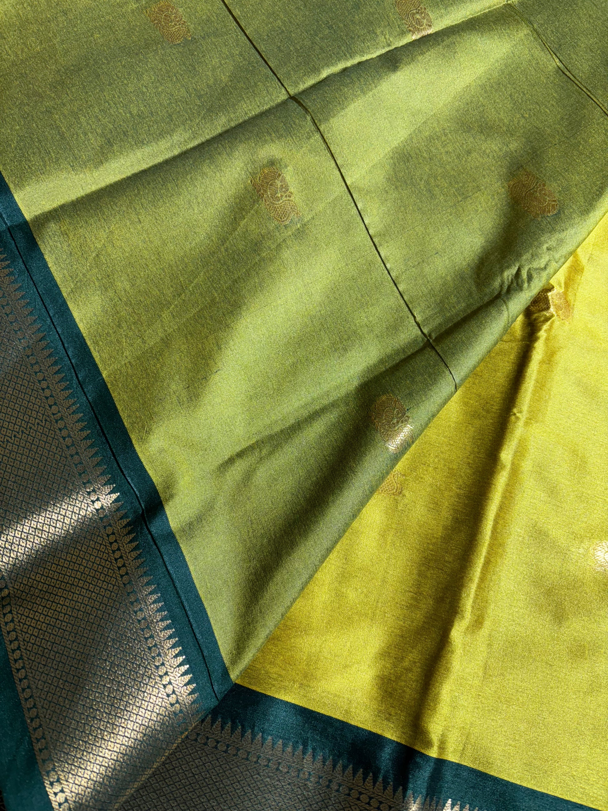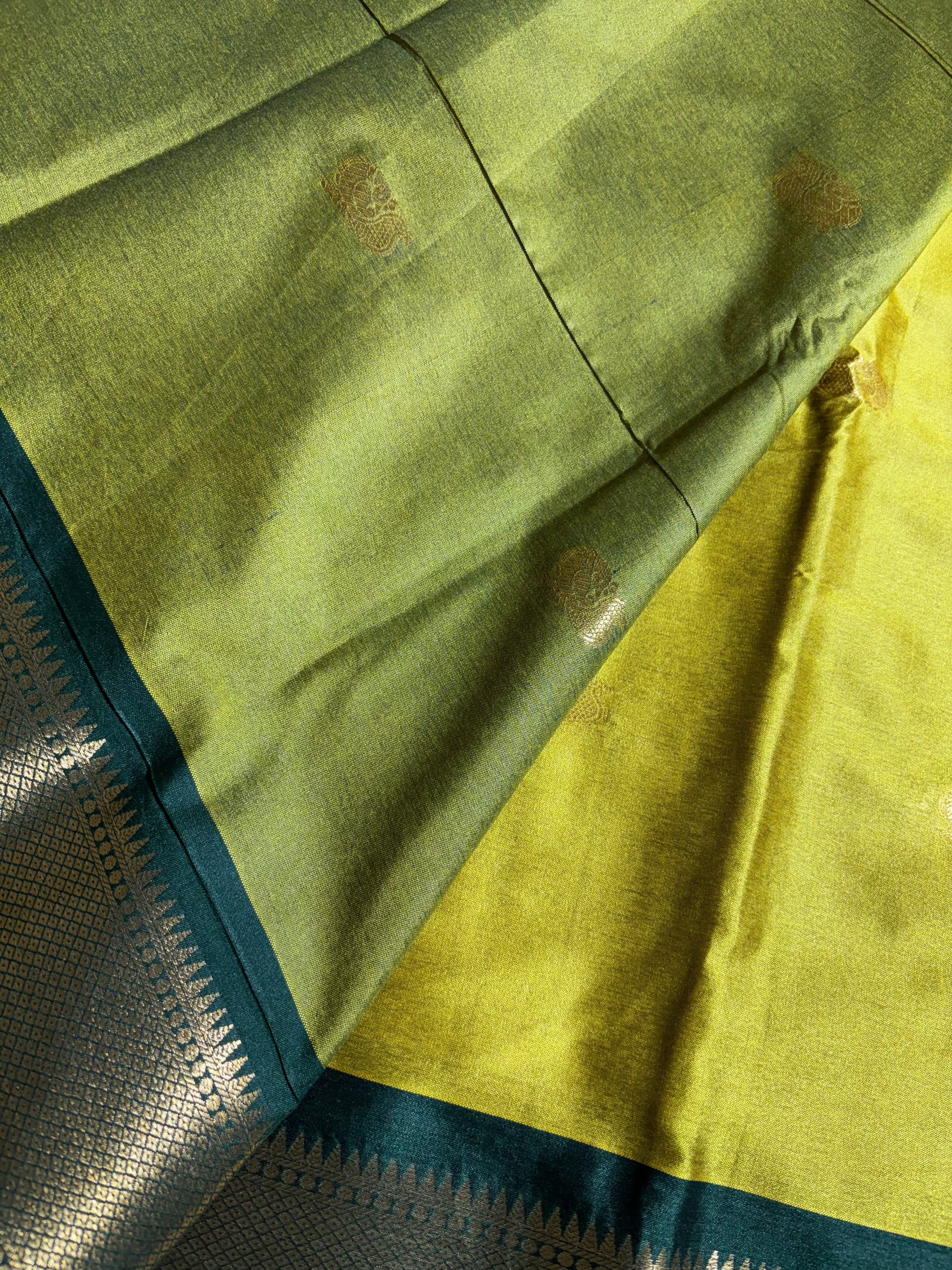 This parrot green saree with bottle green accents features stunning peacock buttas throughout, creating a beautiful and eye-catching design. Made with a silk cotton blend, this saree offers a luxurious and comfortable feel. Perfect for any occasion, this saree will make you stand out and feel confident.