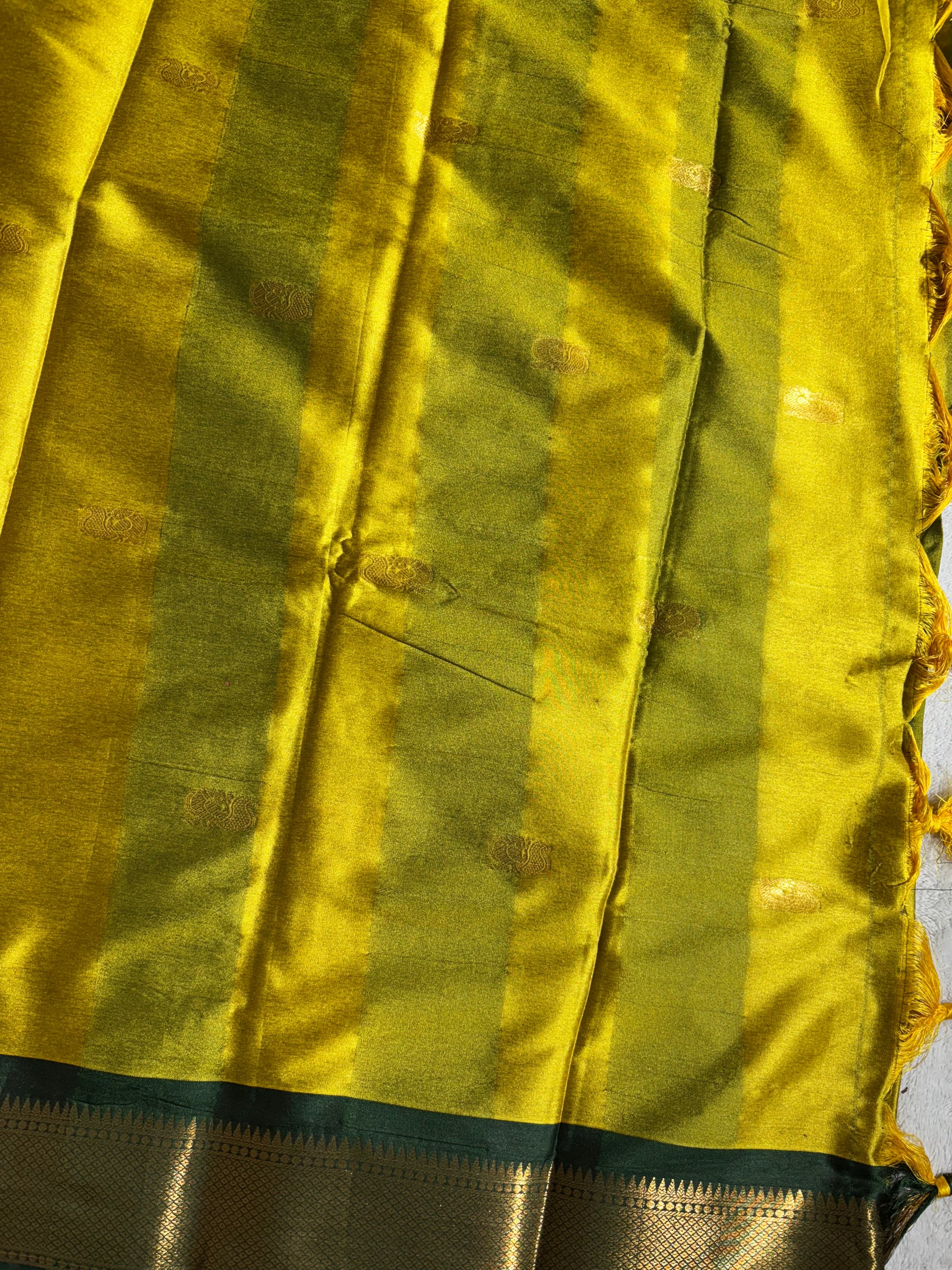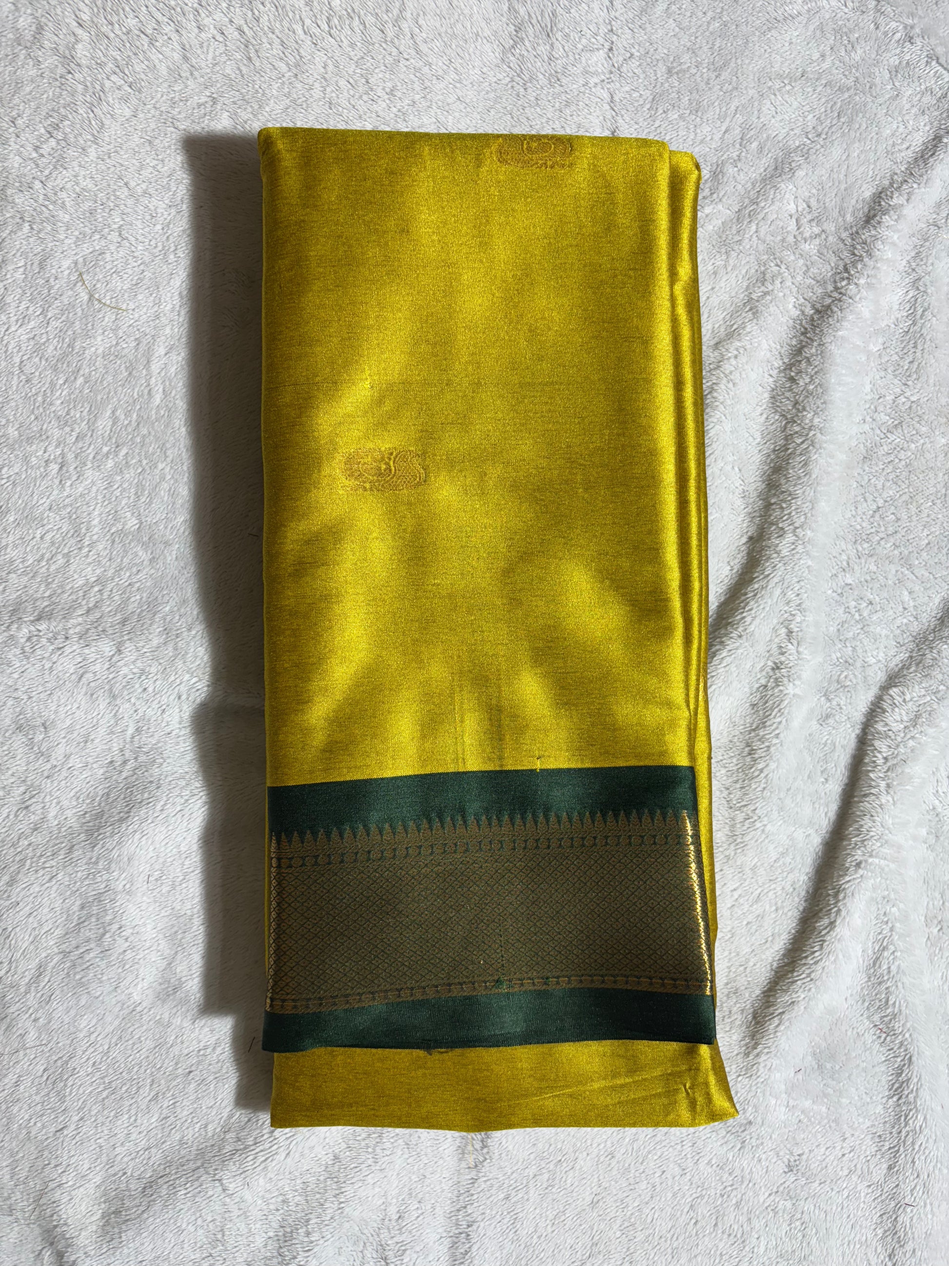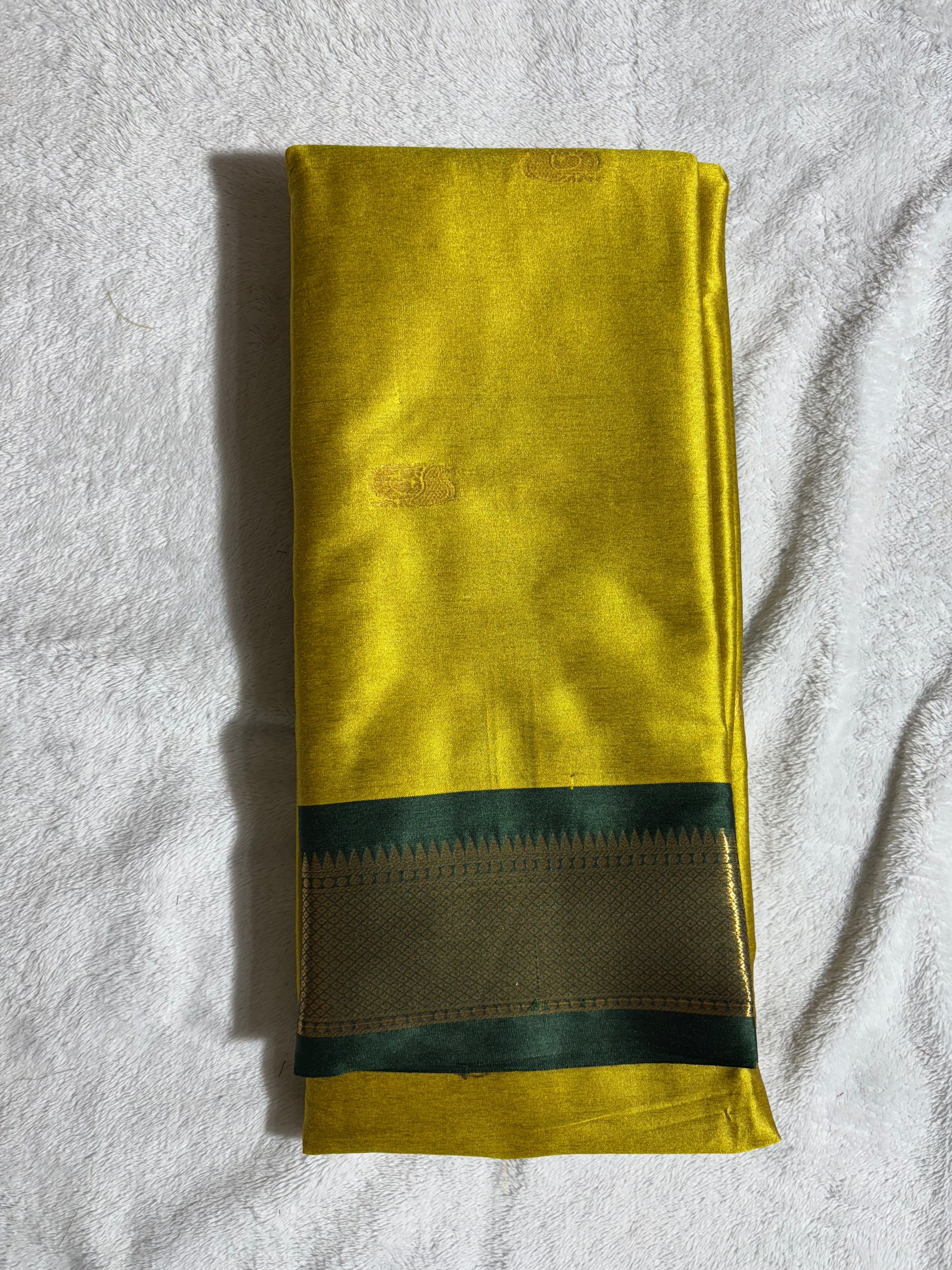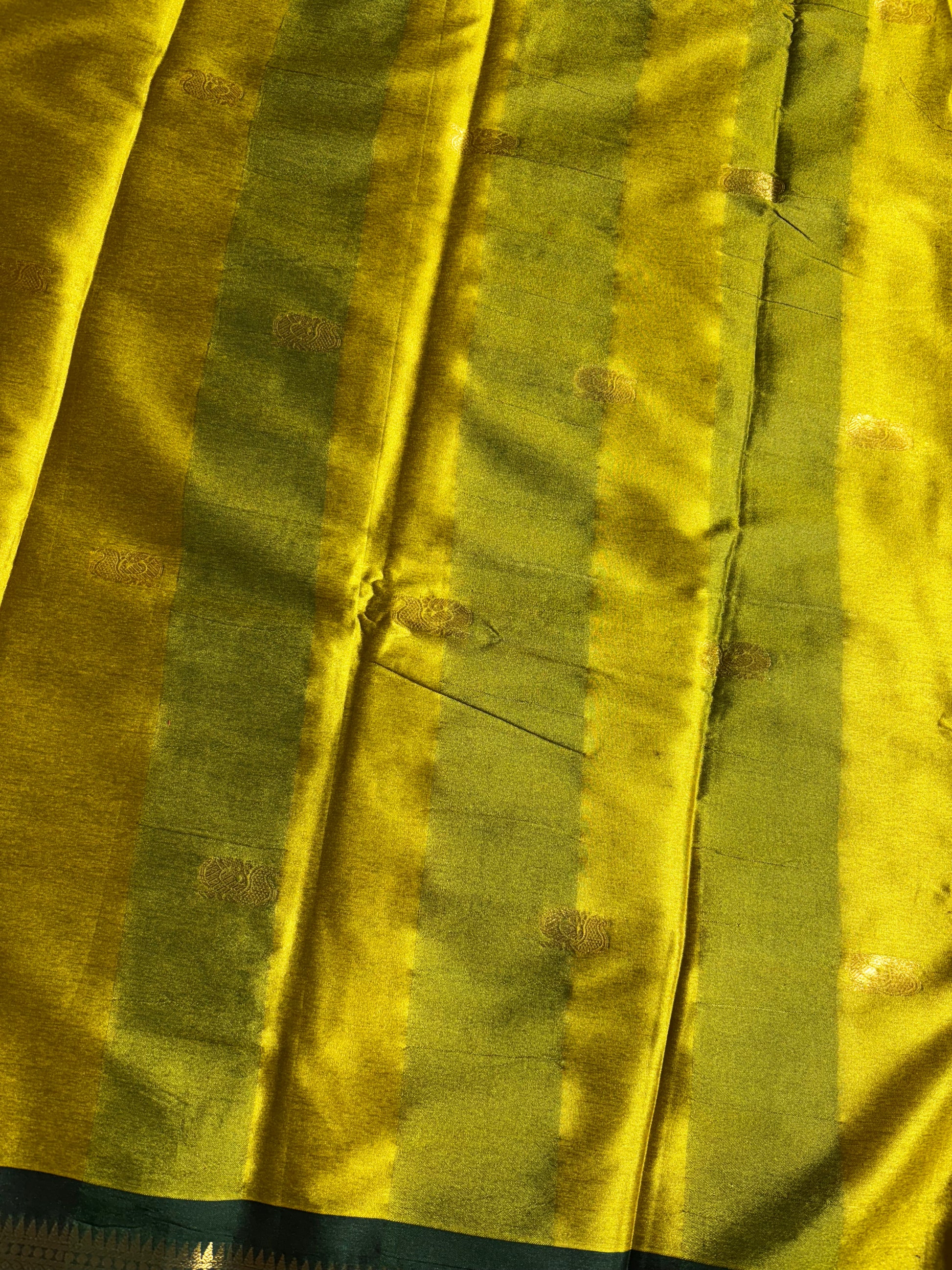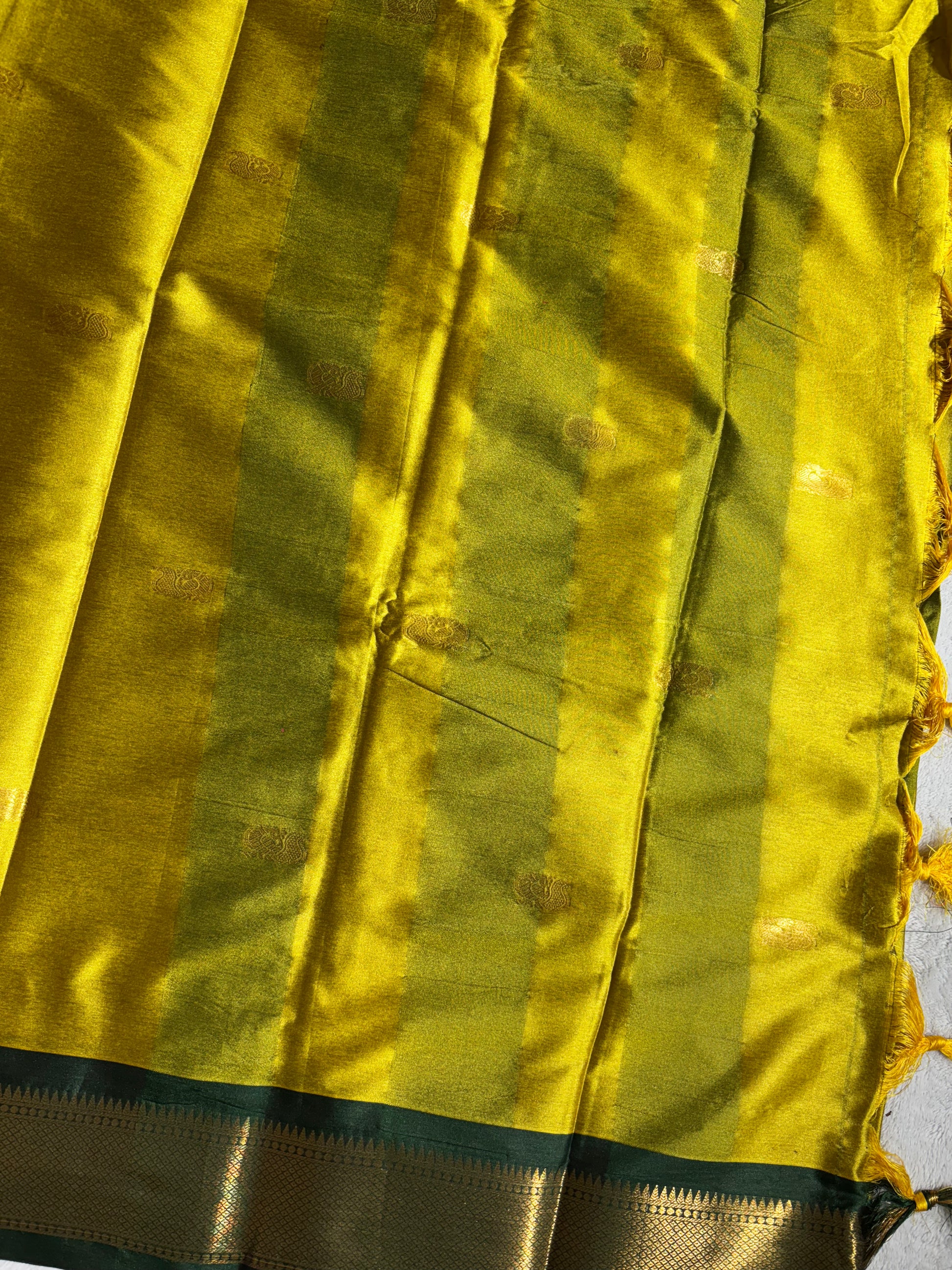This parrot green saree with bottle green accents features stunning peacock buttas throughout, creating a beautiful and eye-catching design. Made with a silk cotton blend, this saree offers a luxurious and comfortable feel. Perfect for any occasion, this saree will make you stand out and feel confident.