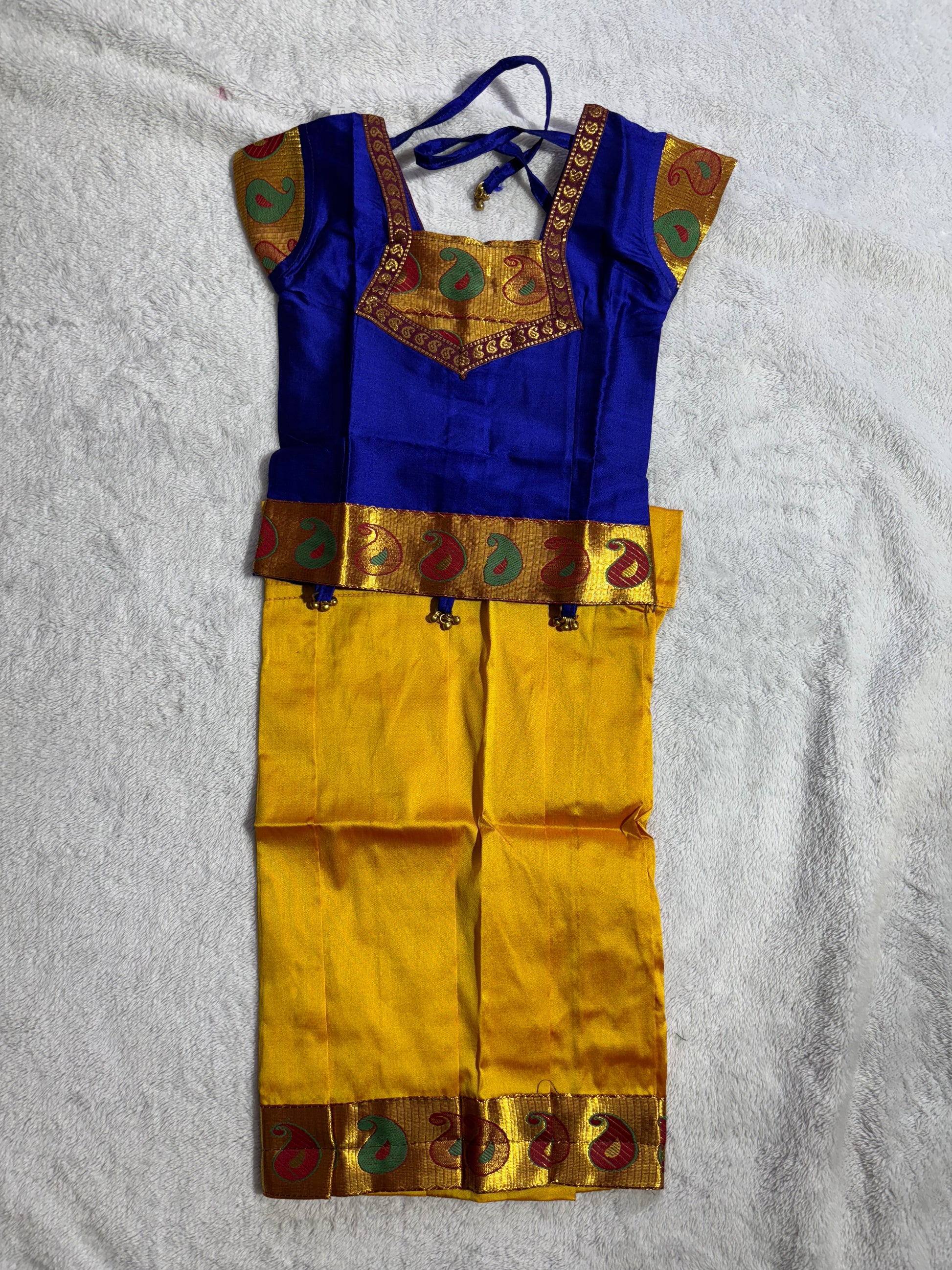 Elevate traditional elegance with this Pattu Pavade set featuring a rich blue blouse paired with a mustard yellow lehenga. Crafted from premium silk, the ensemble offers a vibrant color contrast that enhances festive and ceremonial occasions. The blouse’s deep blue hue complements the warm mustard lehenga, creating a balanced and sophisticated look perfect for cultural celebrations. Designed for comfort and style, this set reflects expert craftsmanship and timeless appeal.