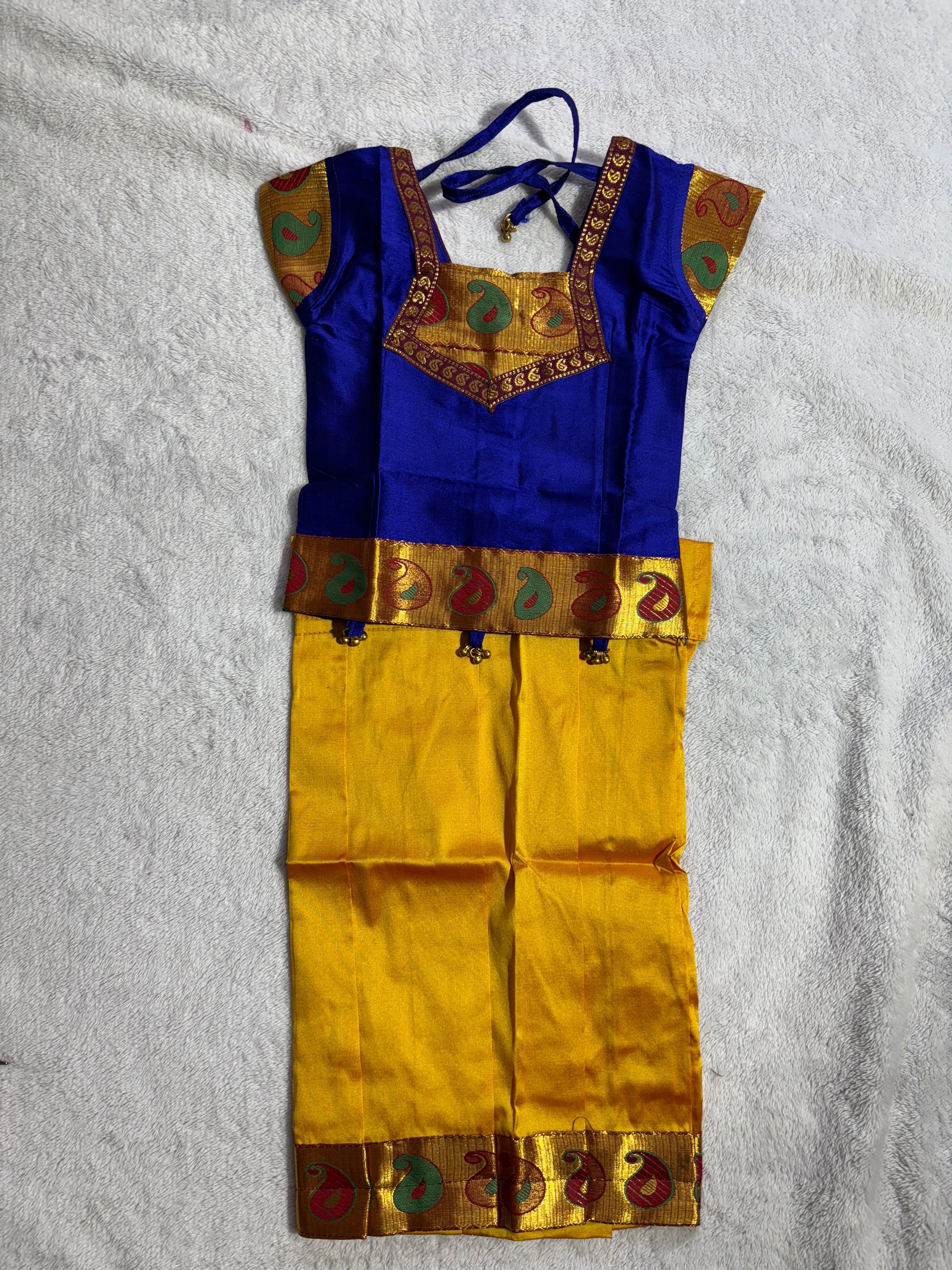Pattu Pavade rich blue blouse paired with a mustard yellow lehenga