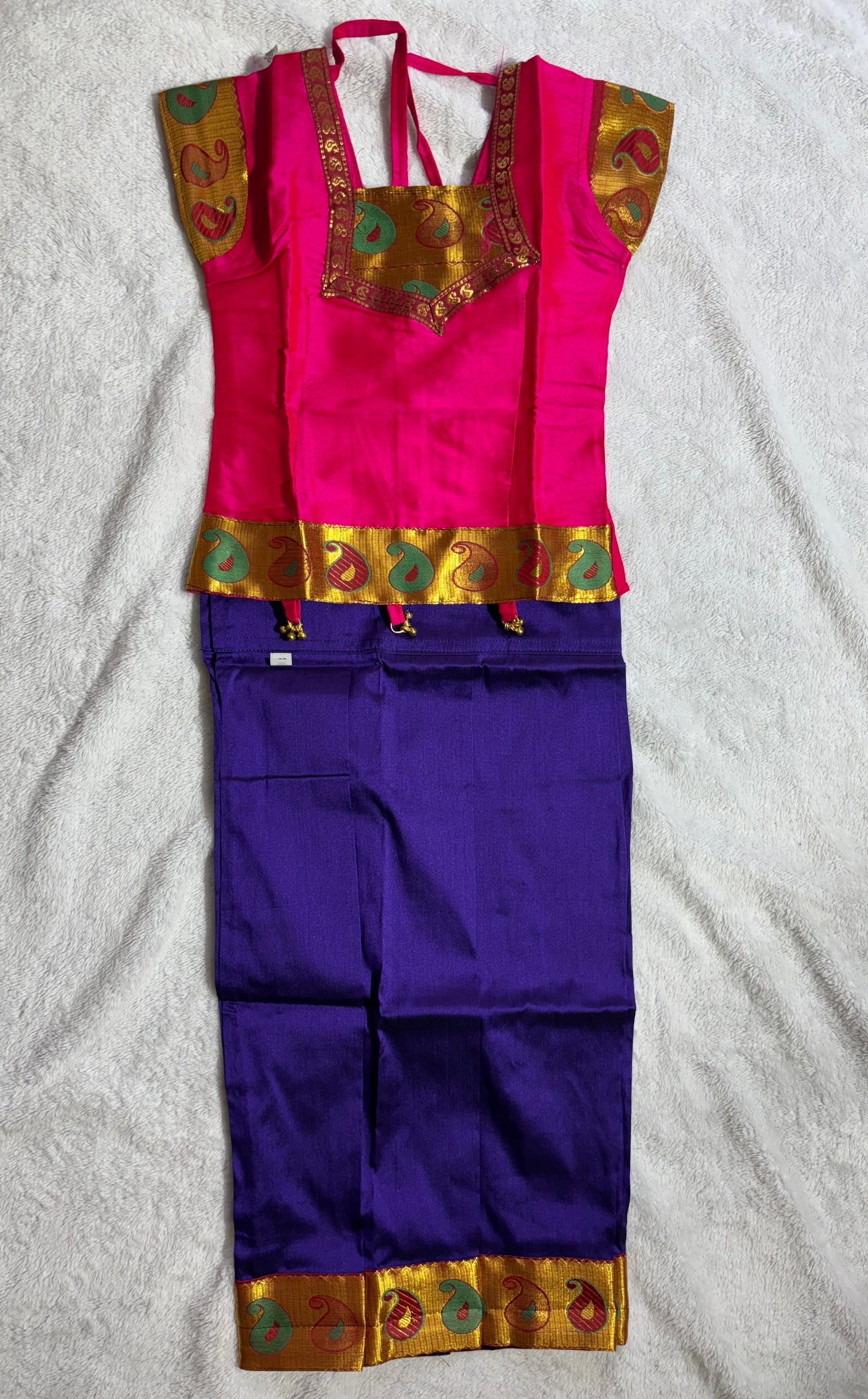 This pink and purple pattu pavadai is perfect for any special occasion. Its vibrant colors and luxurious fabric will make your little one stand out while providing comfort and style. Made with premium materials, this traditional Indian outfit is sure to impress.
