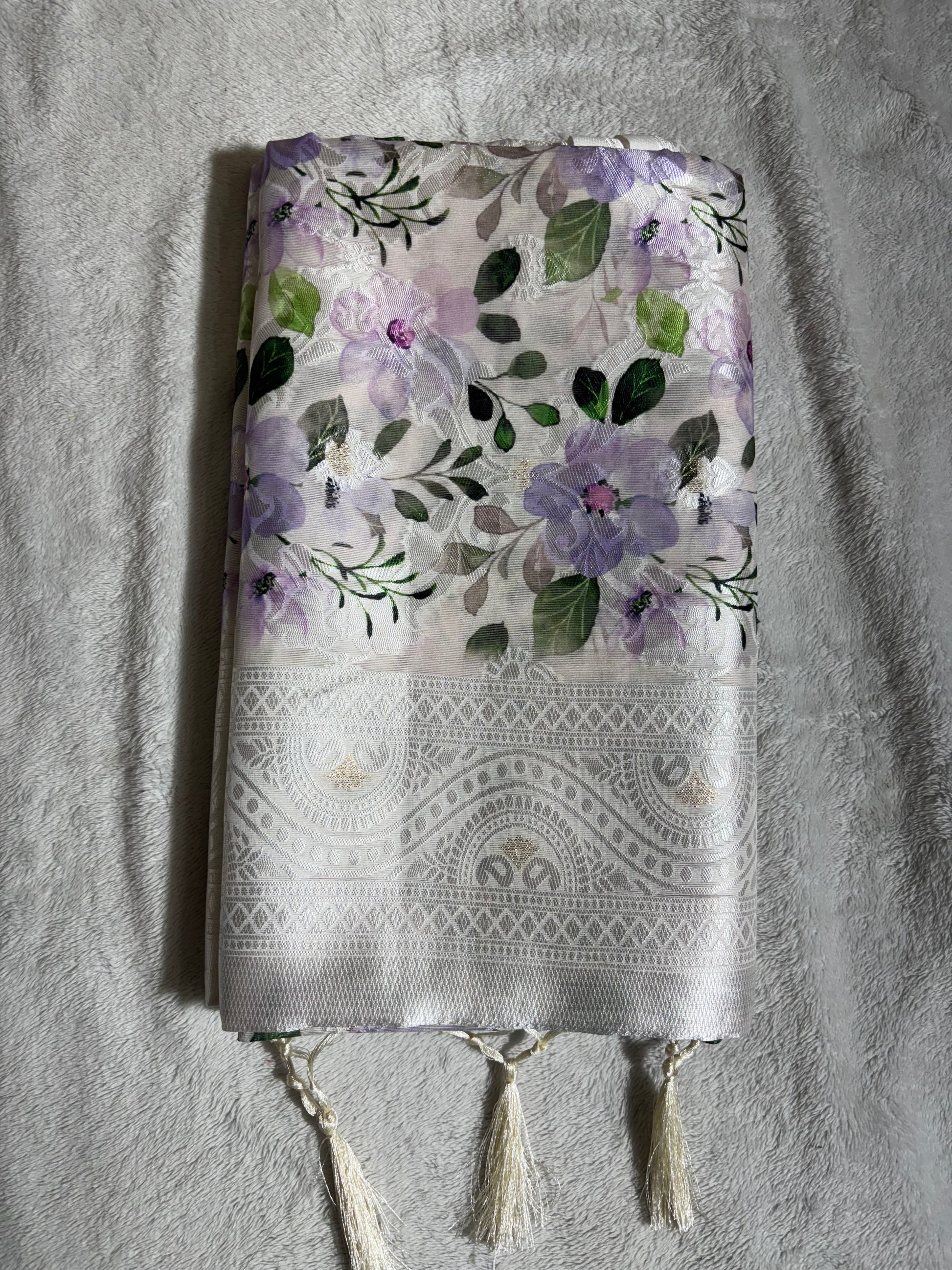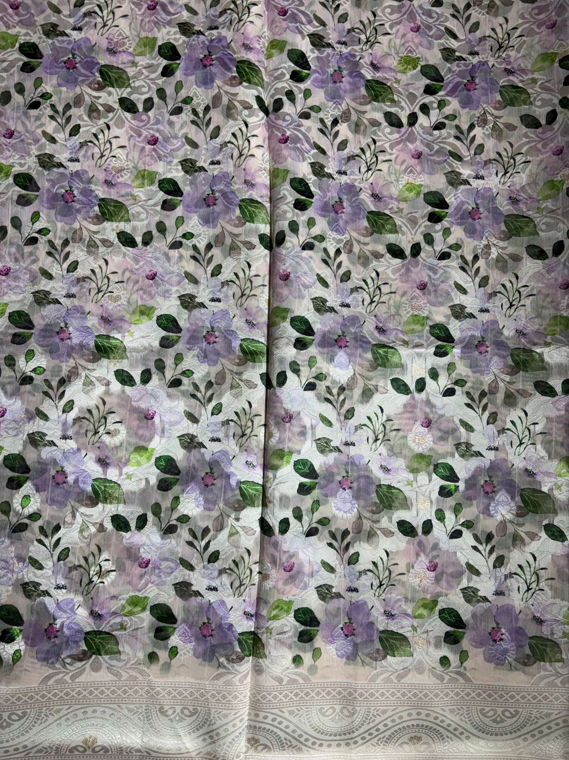 Experience elegance and comfort in our Purple Flower Prints on White Cotton Silk Saree. With floral prints scattered across the saree, this saree exudes femininity and sophistication. Made of soft cotton silk, it also features delicate tassels that add a touch of playfulness to the look. Perfect for any occasion.