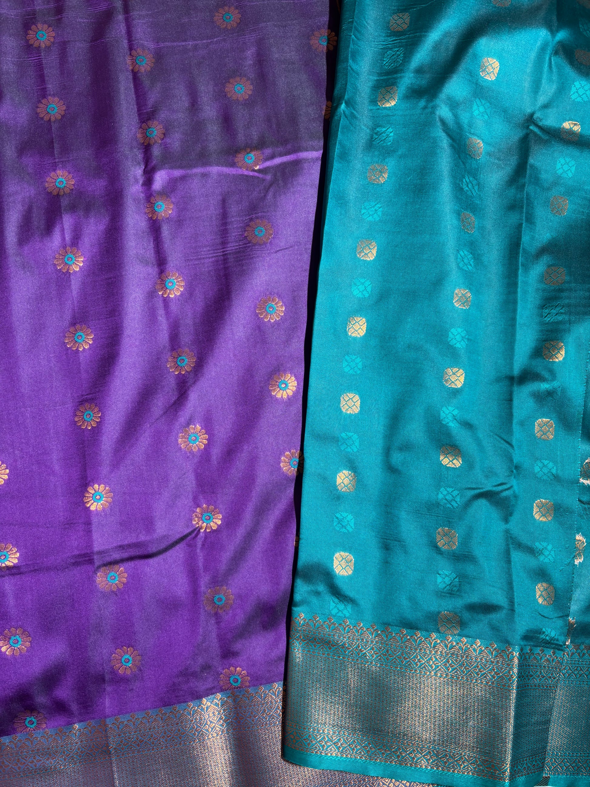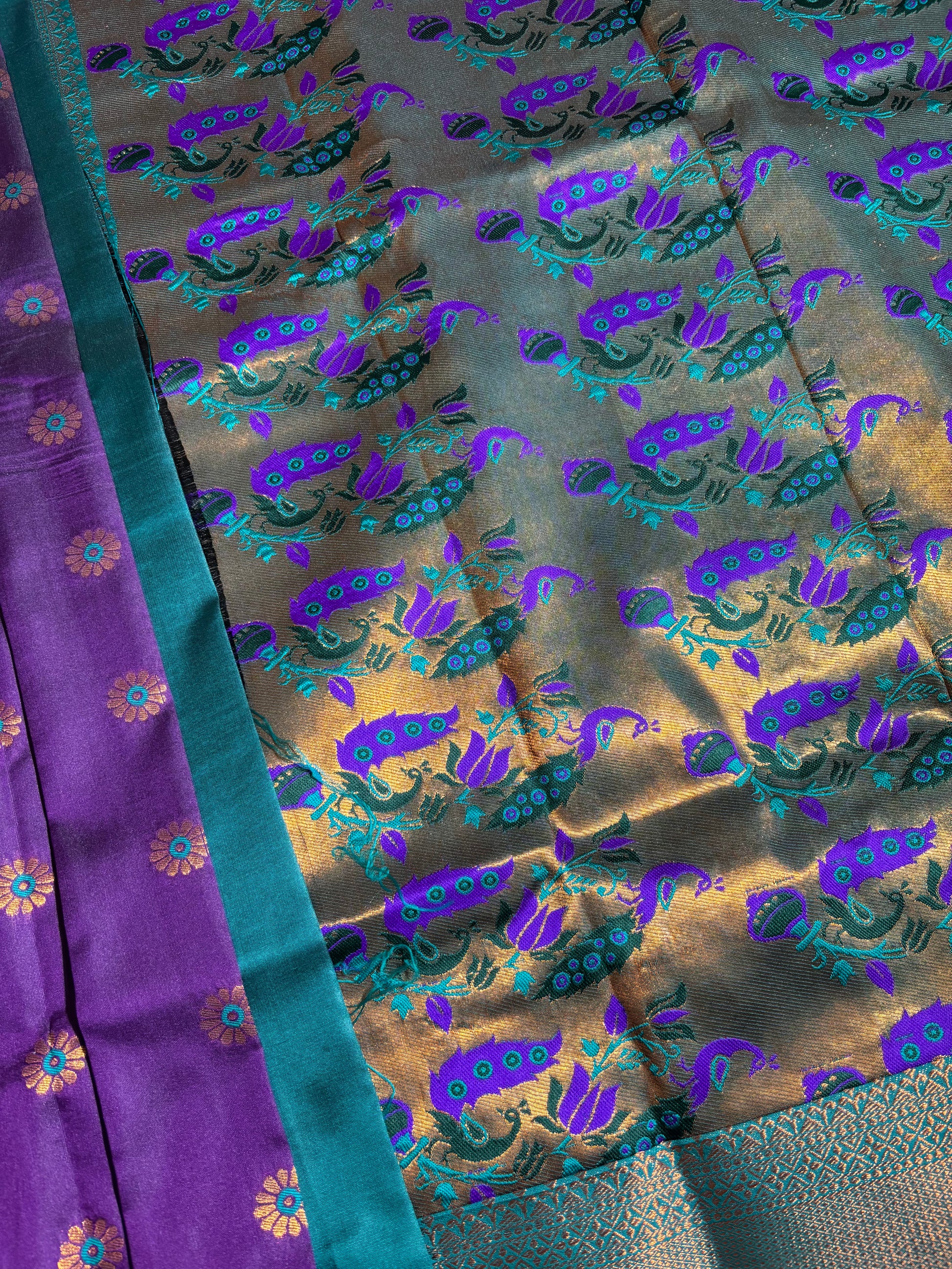 Expertly crafted with a blend of purple and green soft silk, this saree features delicate flower butta designs throughout. Experience the luxurious feel of silk while flaunting this stunning piece. Elevate your ethnic wardrobe with this timeless and elegant saree.