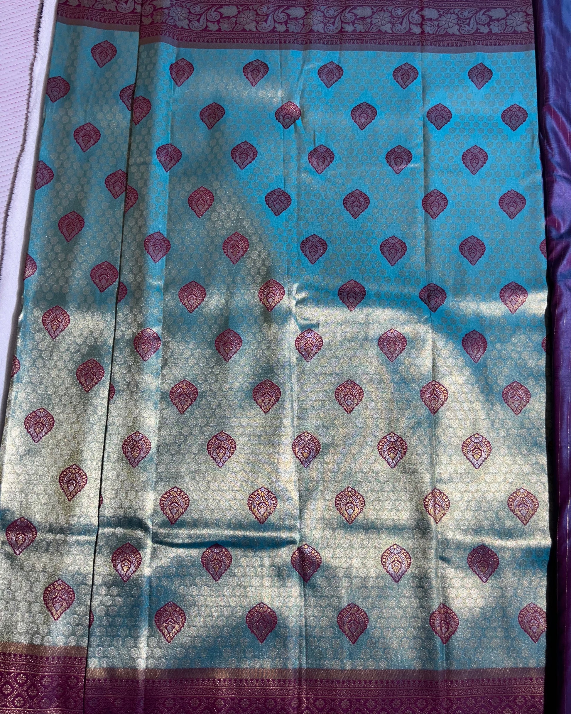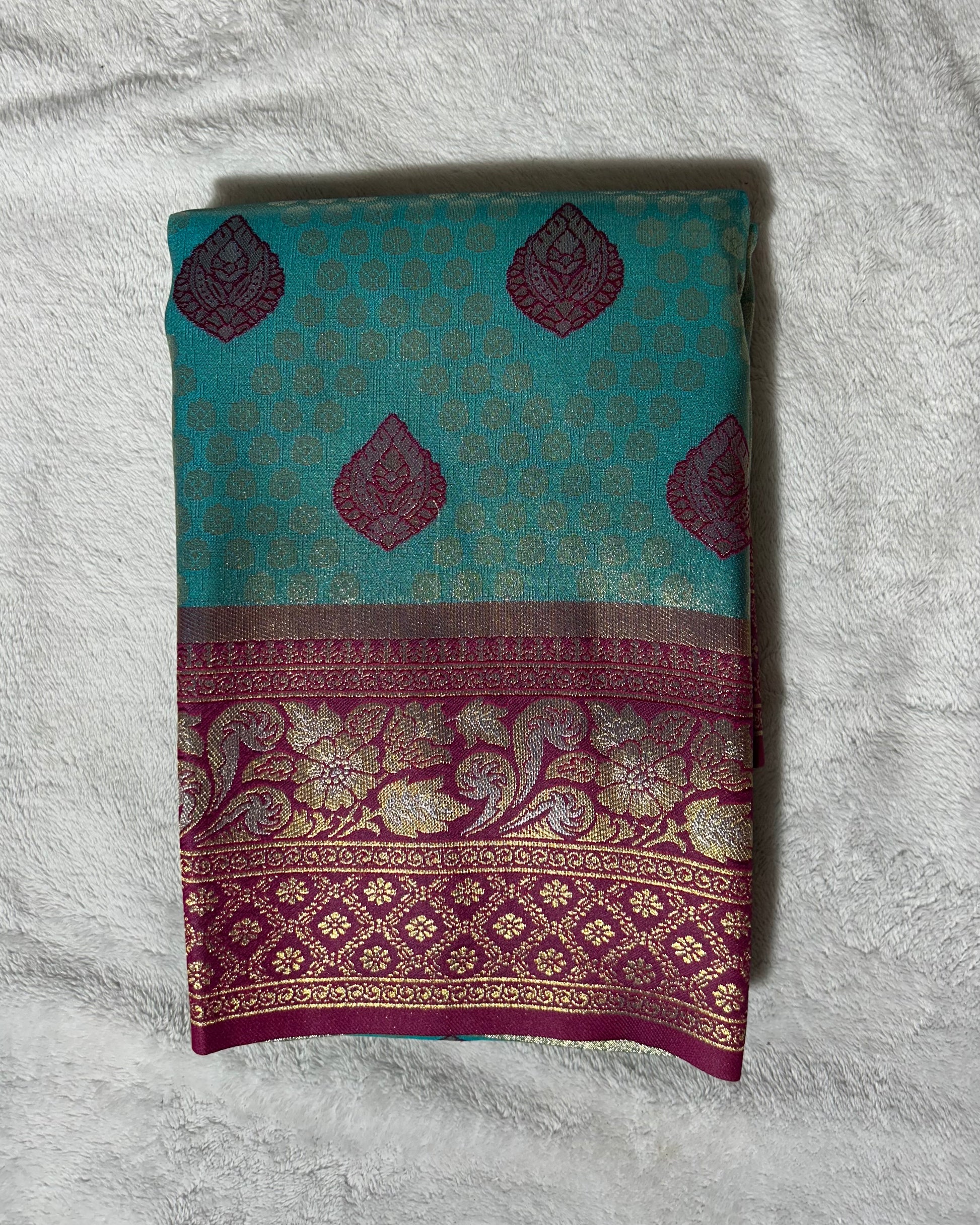 This exquisite Rama Green with Maroon Banaras Kanchipuram silk saree features traditional buttas throughout, perfect for a bridal collection. Made with high-quality silk, this saree offers a stunning combination of colors that exude elegance and charm. Elevate your wardrobe with this timeless and sophisticated piece.