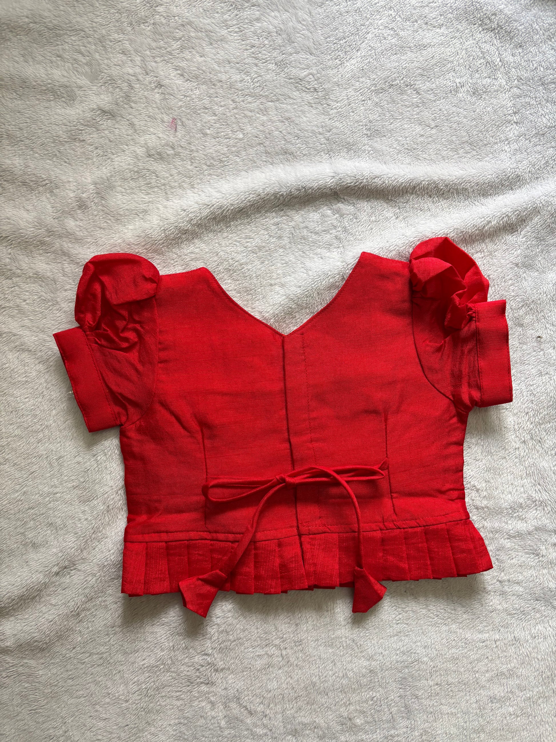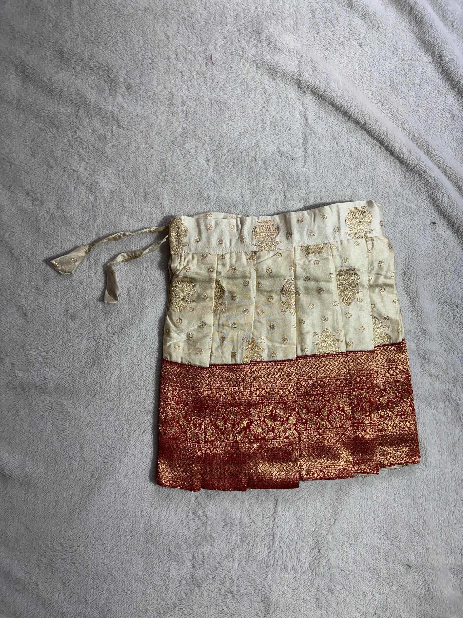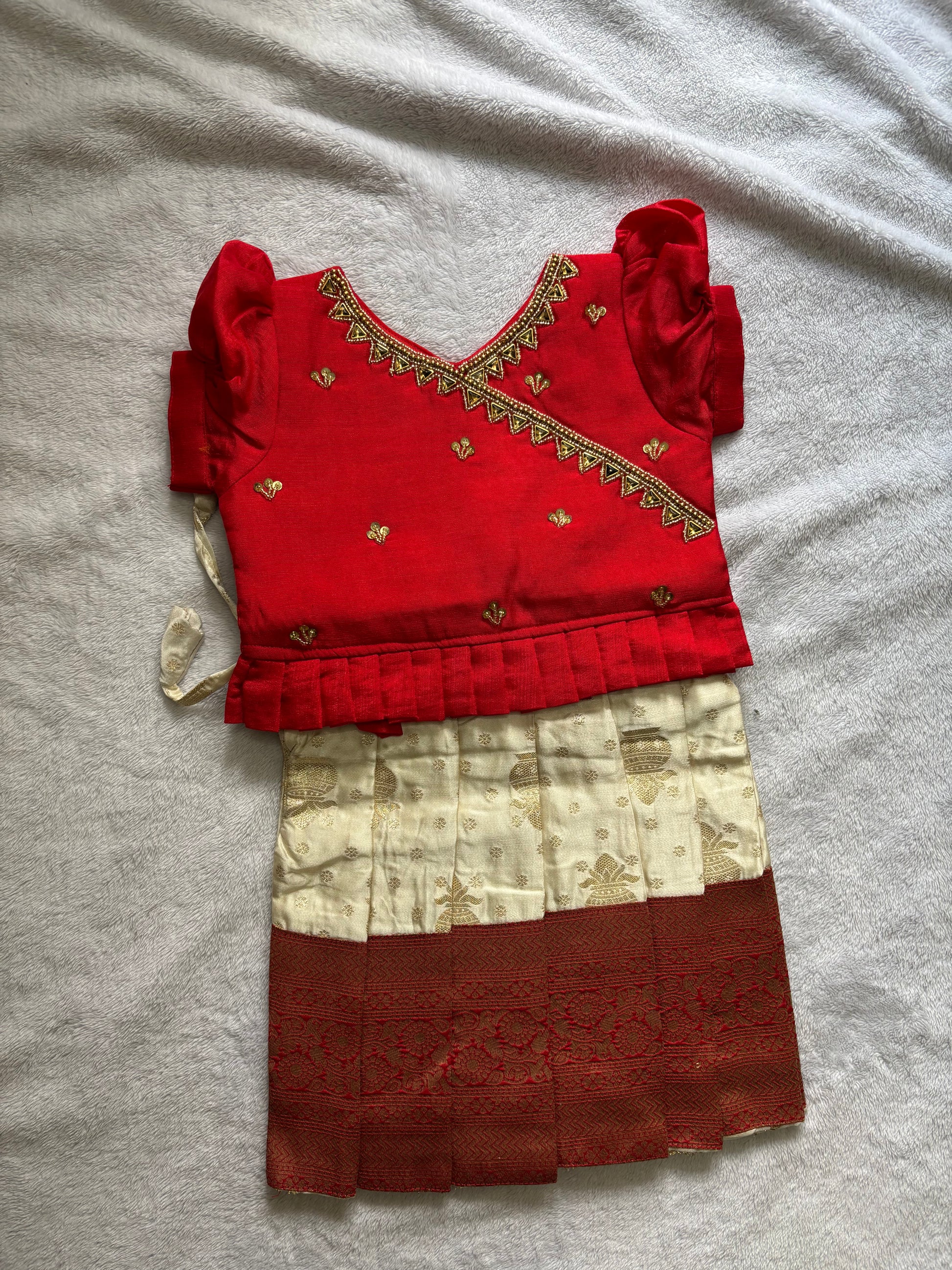 This elegant pattu pavadai features a striking combination of red and half white fabric, perfectly balanced for a traditional yet contemporary look. The blouse is adorned with intricate handmade Ari embroidery, showcasing expert craftsmanship that adds texture and sophistication. Ideal for festive occasions, this ensemble blends rich silk with detailed artistry, ensuring both comfort and style for the wearer.