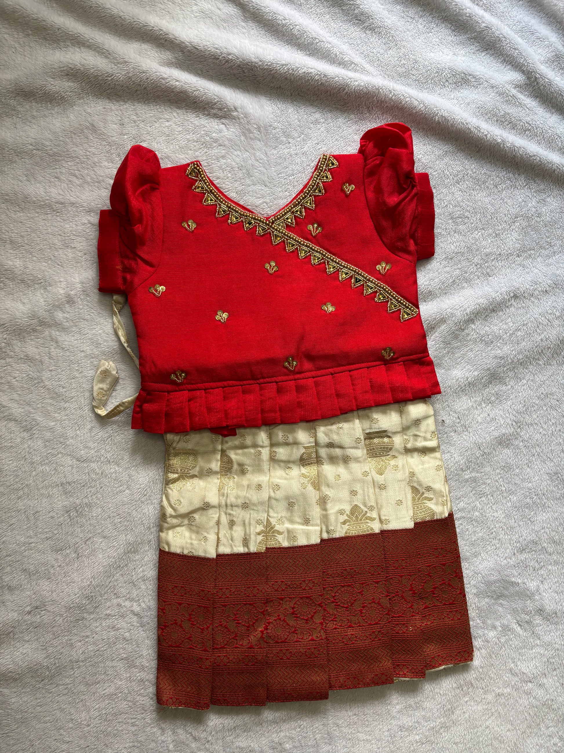 Red and half white pattu pavadai with handmade Ari work all over the jacquard blouse