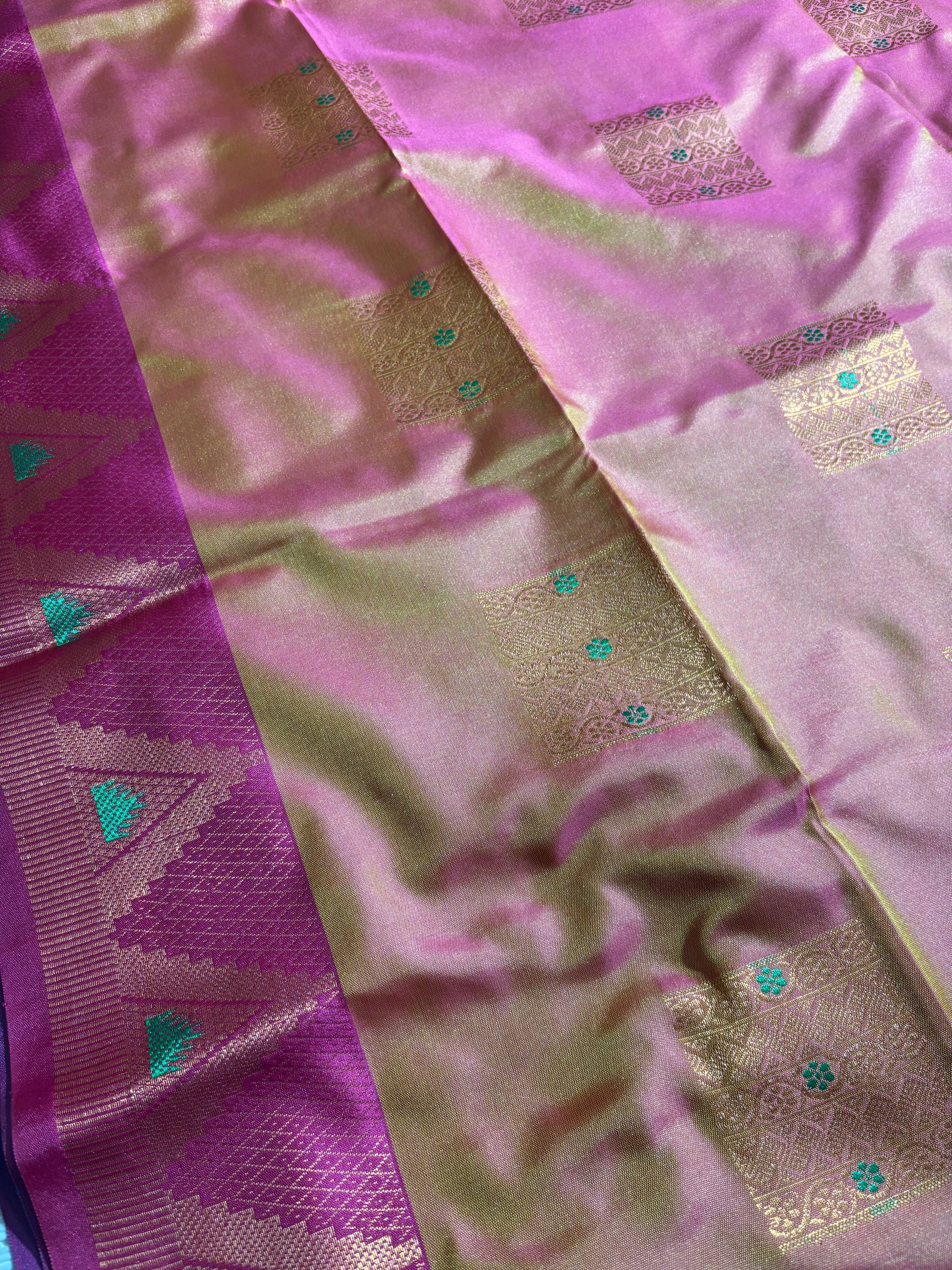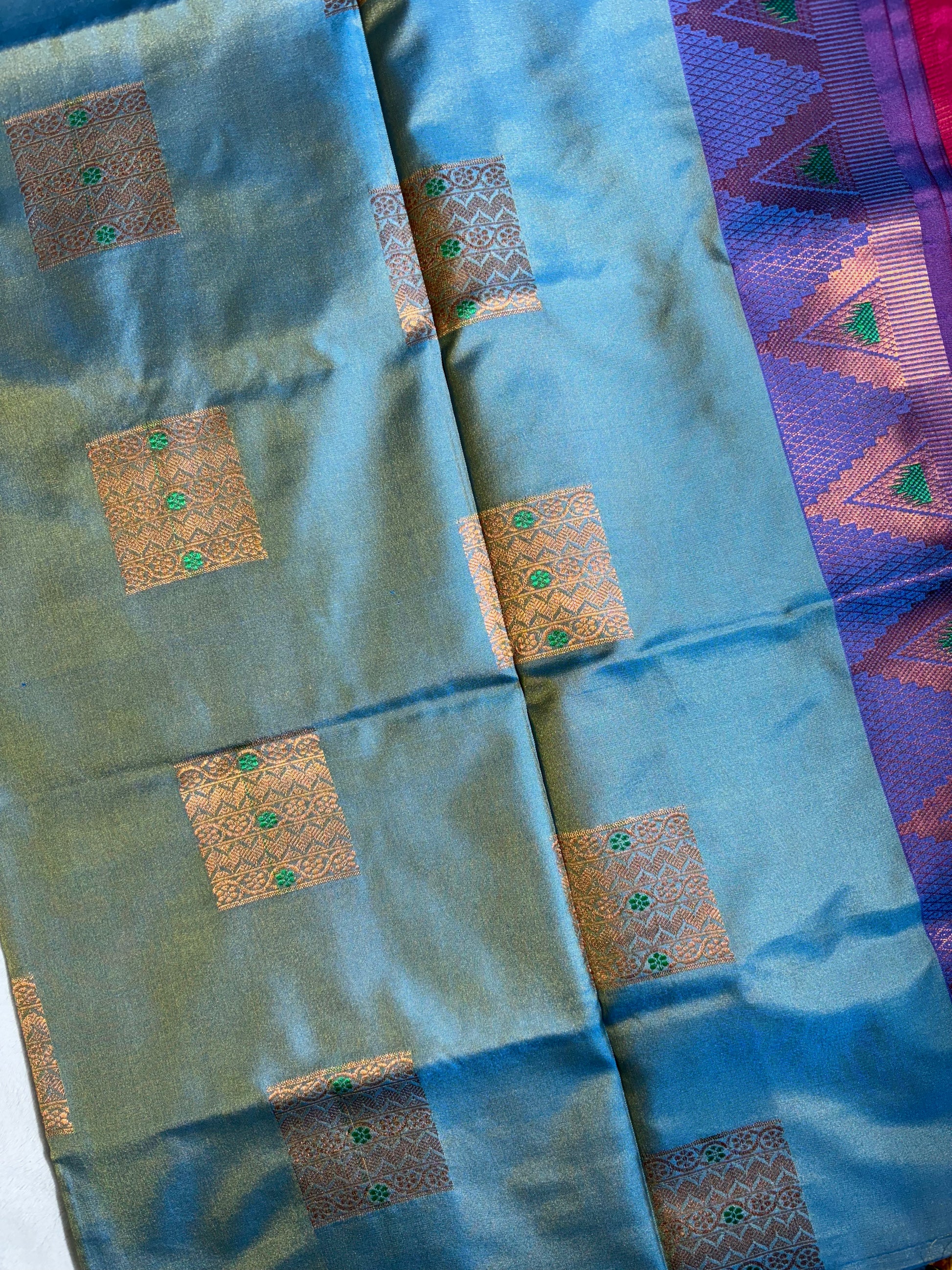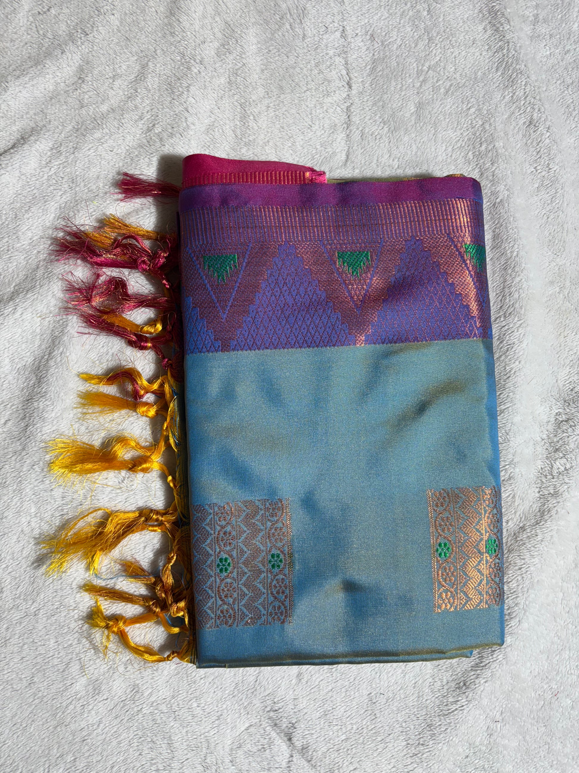 Experience the luxurious feel of our sea blue with purple soft silk saree, featuring a stunning temple border and delicate tassels. Elevate your style with the perfect balance of elegance and comfort. Perfect for any occasion, this saree is a must-have addition to your wardrobe.