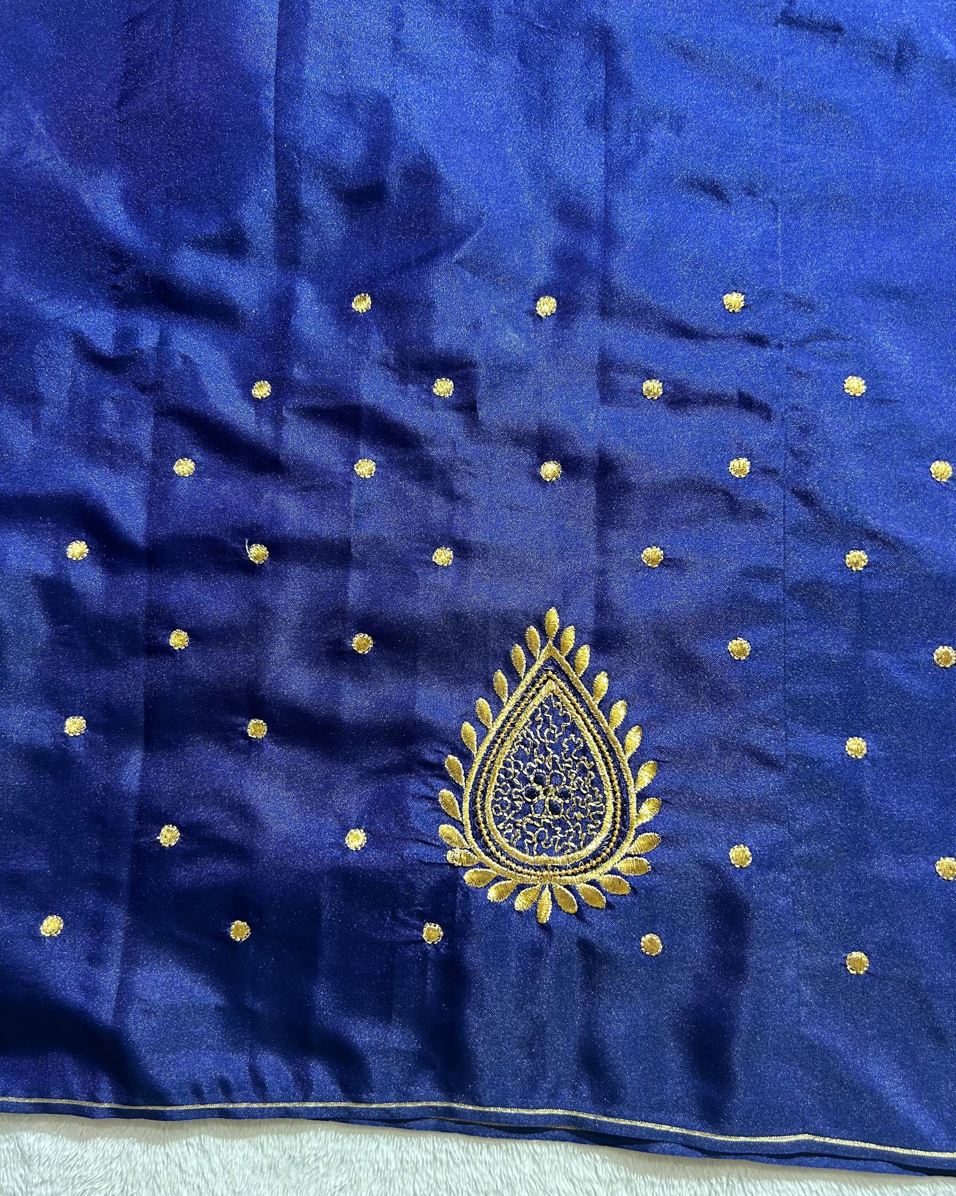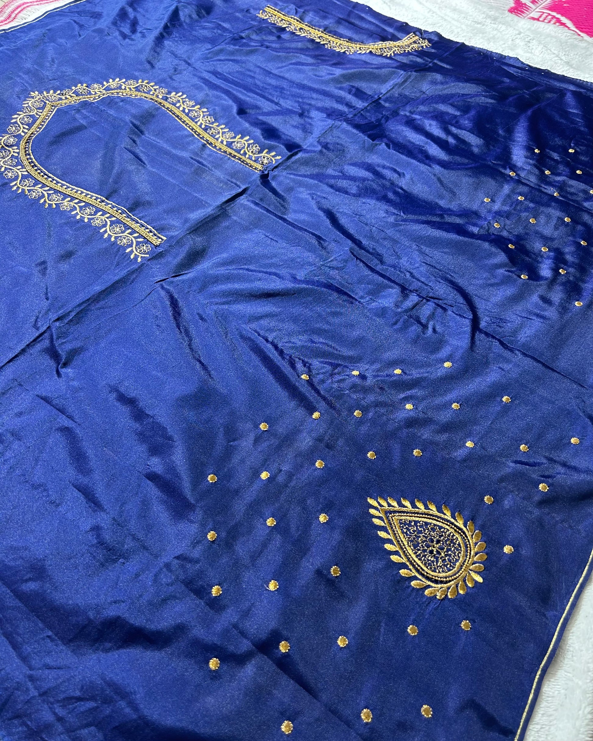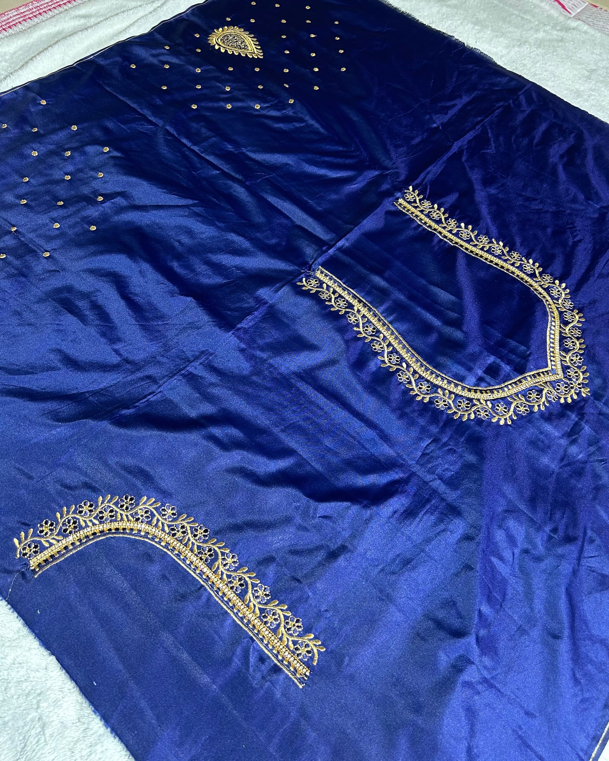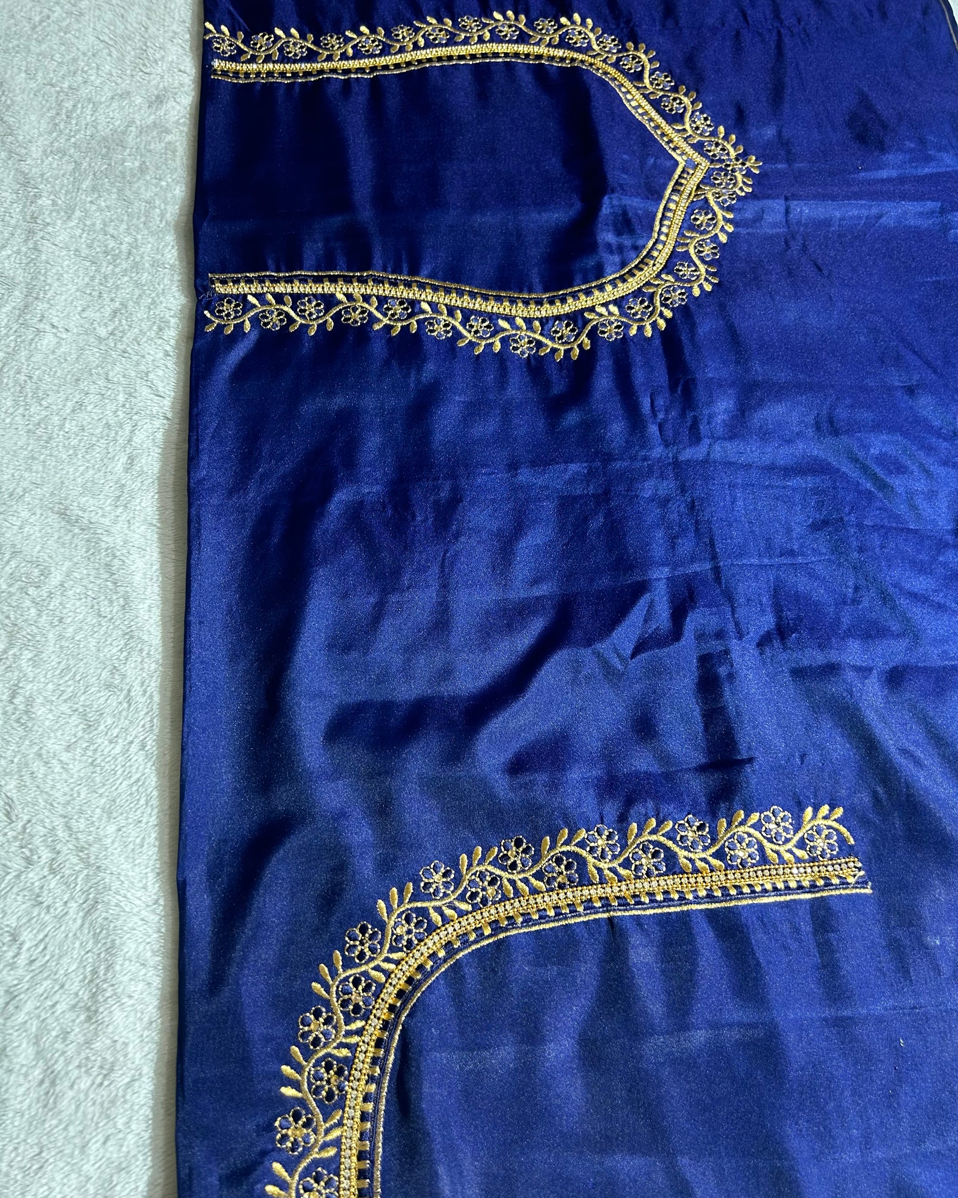 "Expertly crafted from luxurious silk, this navy blue blouse is adorned with delicate work on the back, front, and sleeves. Elevate your wardrobe with this timeless and elegant piece, perfect for any occasion."