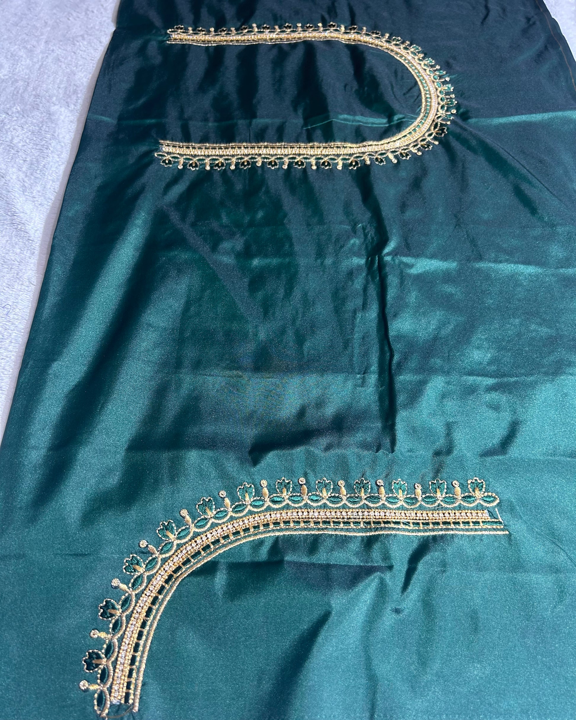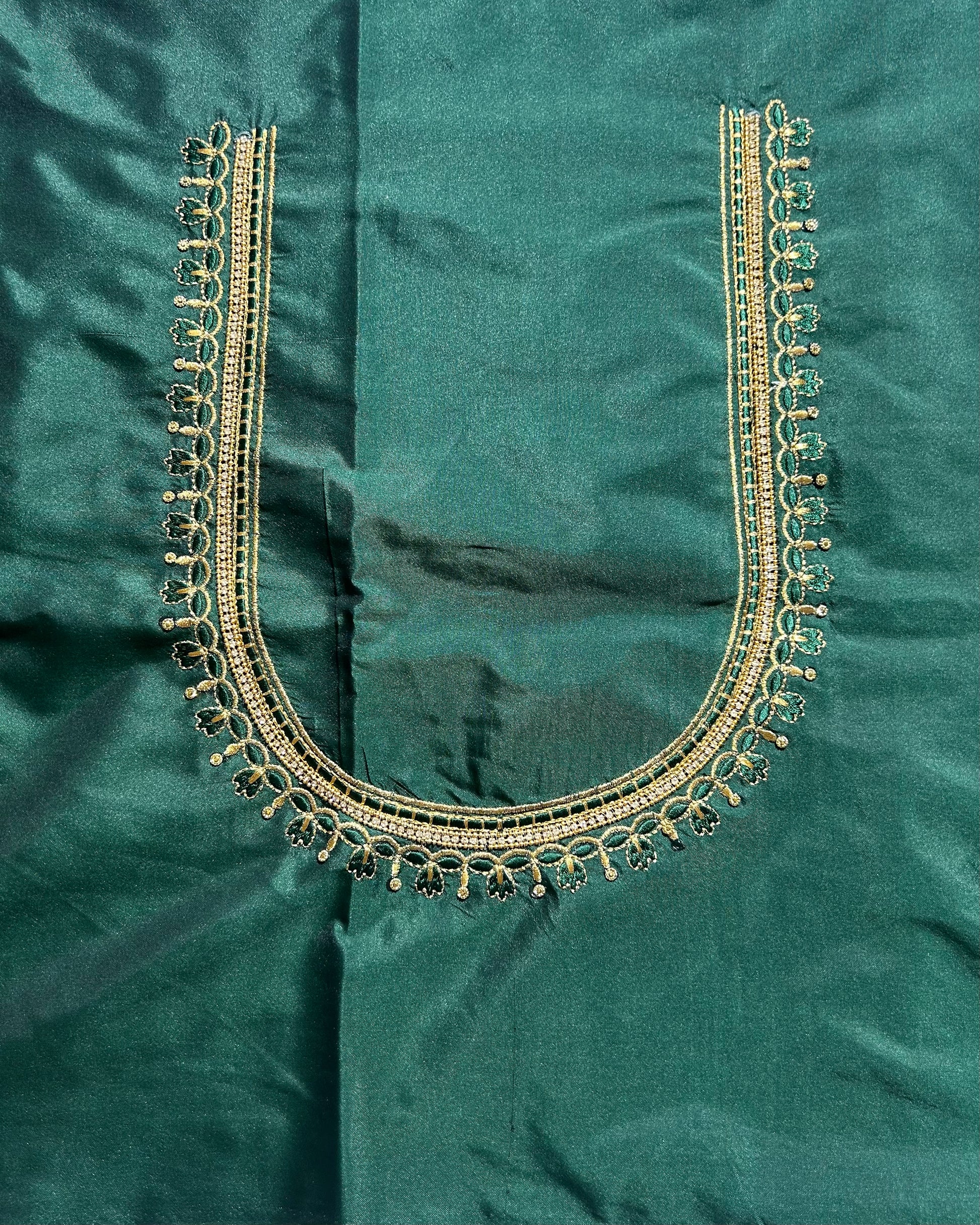 Crafted from high-quality silk, this green blouse material is adorned with delicate work, making it a luxurious addition to any wardrobe. Experience the softness and sheen of silk while looking effortlessly elegant. Perfect for formal occasions or adding a touch of sophistication to your everyday attire.