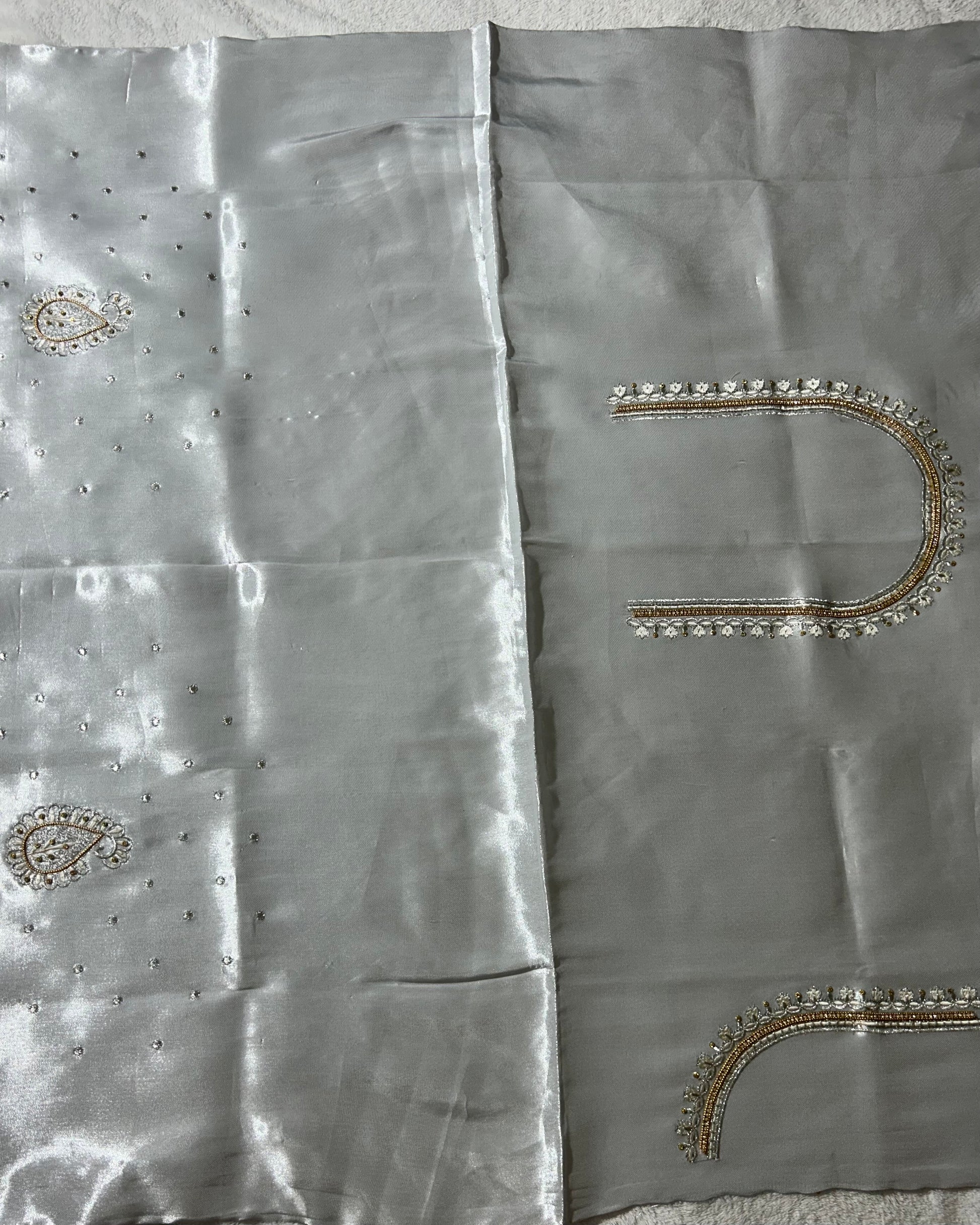 This luxurious silver silk blouse material features intricate work on the neck and sleeves, adding a touch of elegance to any outfit. Made with high-quality silk, it offers a comfortable and stylish option for any occasion. Elevate your wardrobe with this sophisticated piece.