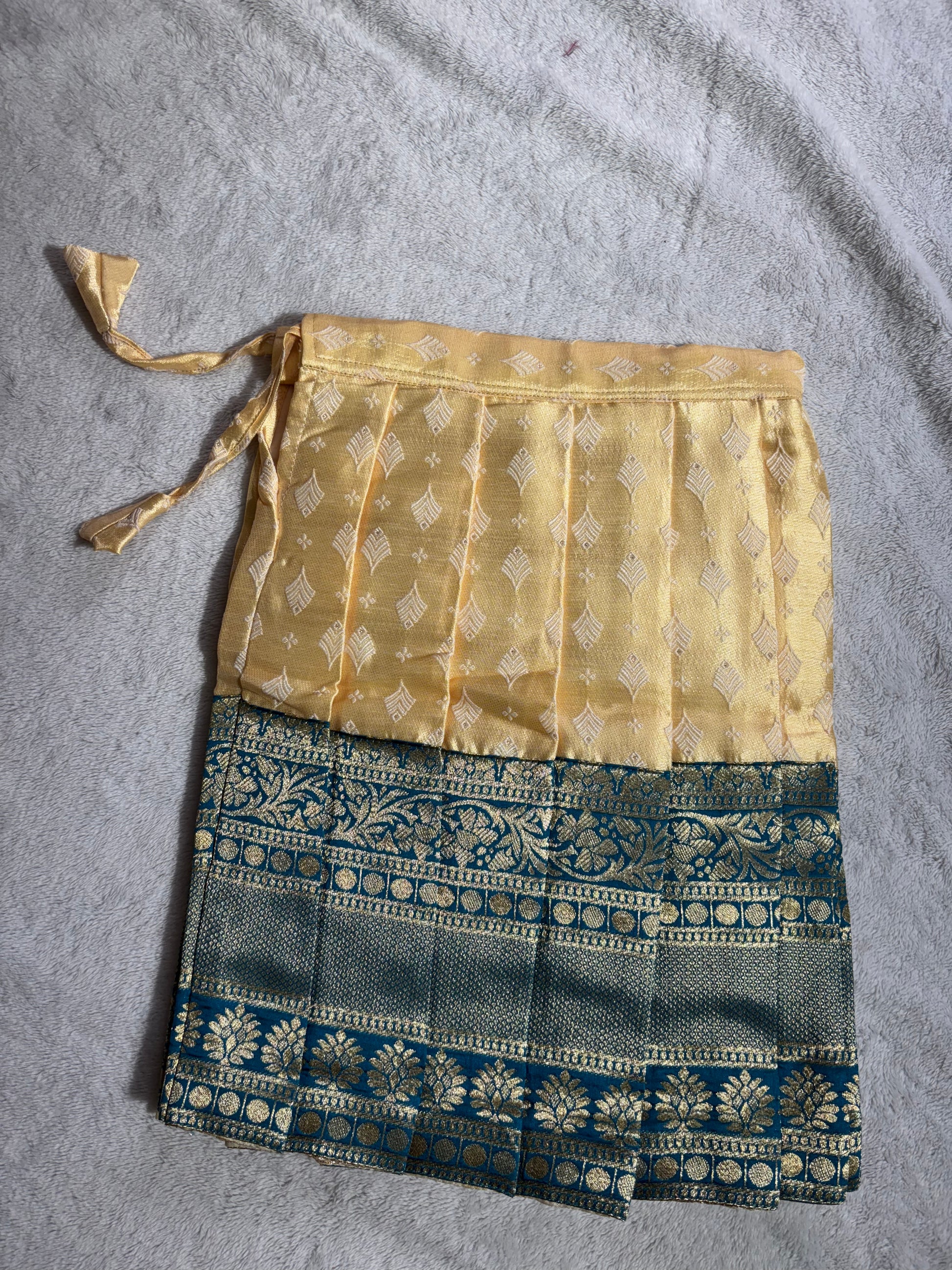 This elegant yellow lehenga is paired with a vibrant green blouse, featuring intricate handmade aari work throughout. The beautiful combination of colors and handcrafted details makes for a stunning and unique outfit. Perfect for any special occasion, this lehenga set is sure to make a statement.