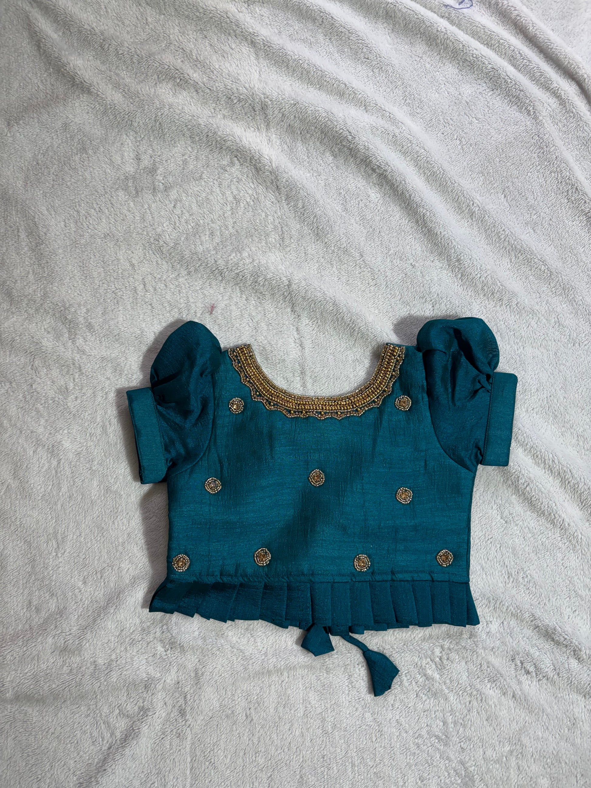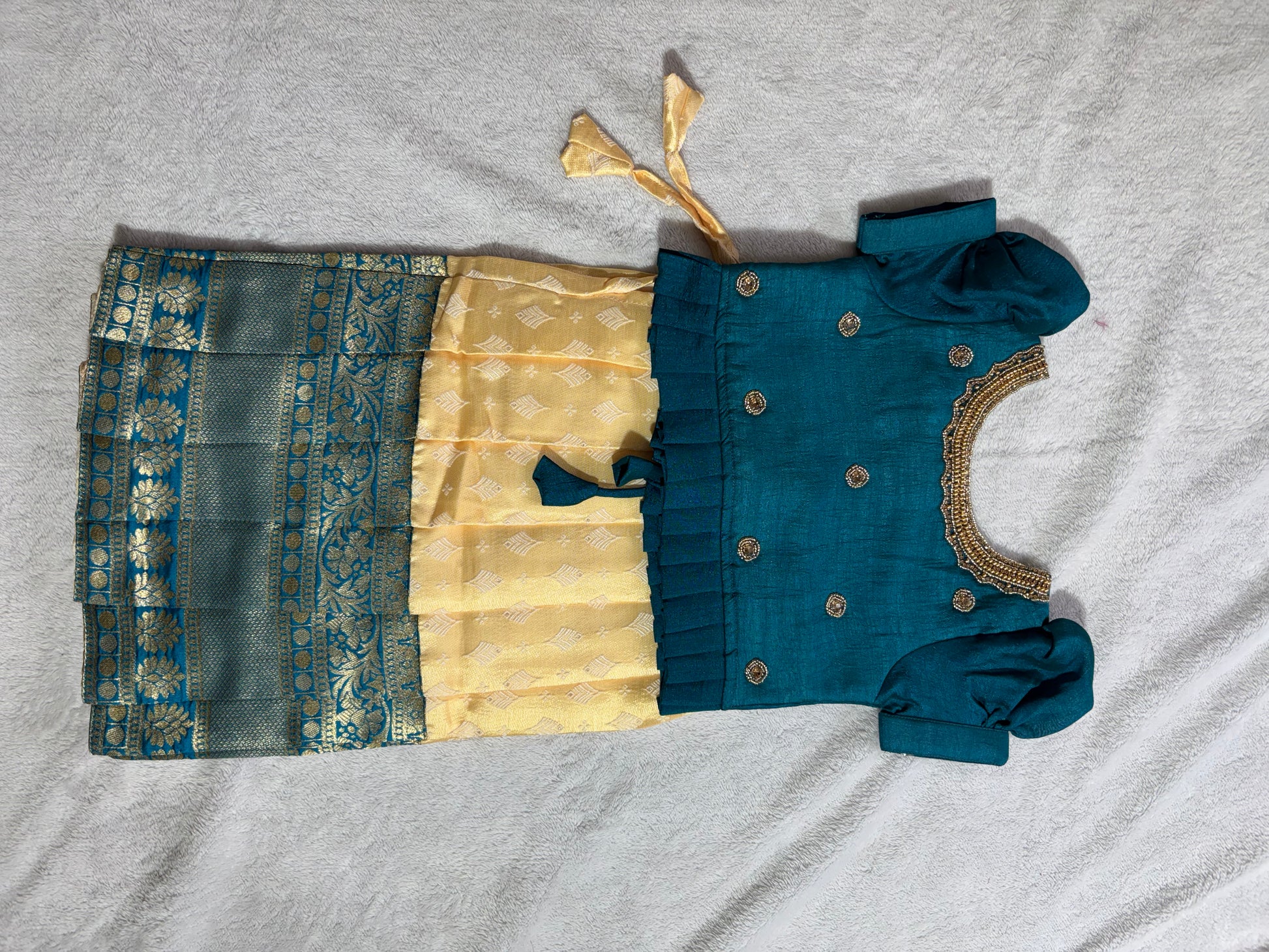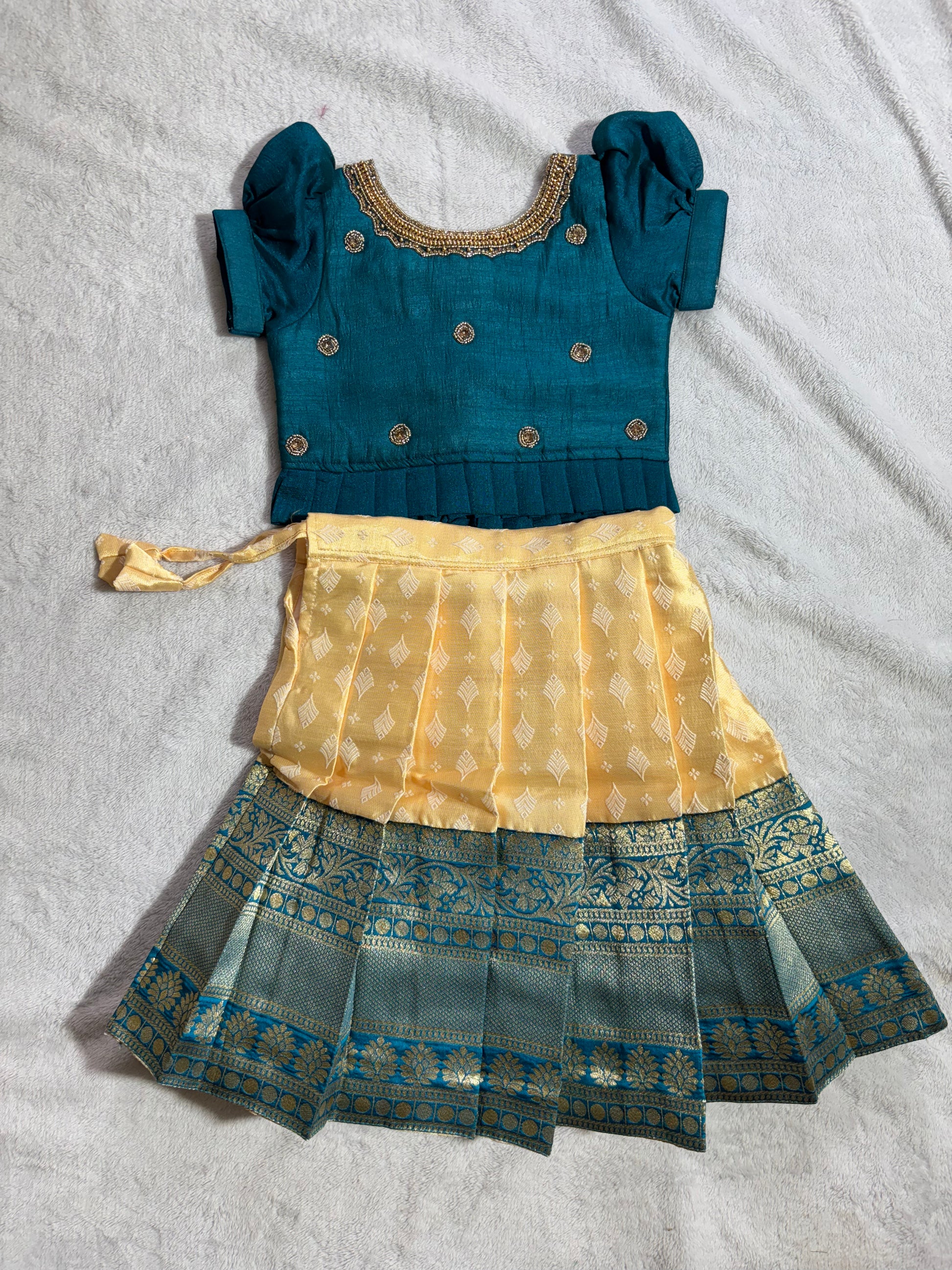 Yellow lehenga with green blouse with handmade aari work all over the blouse